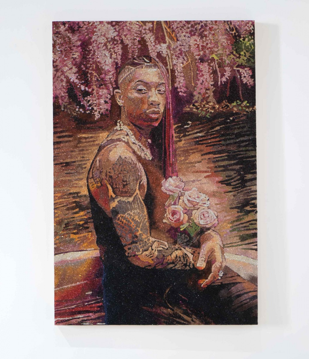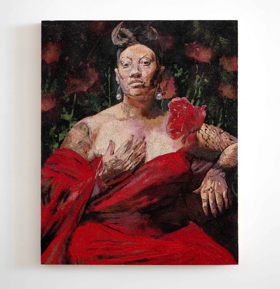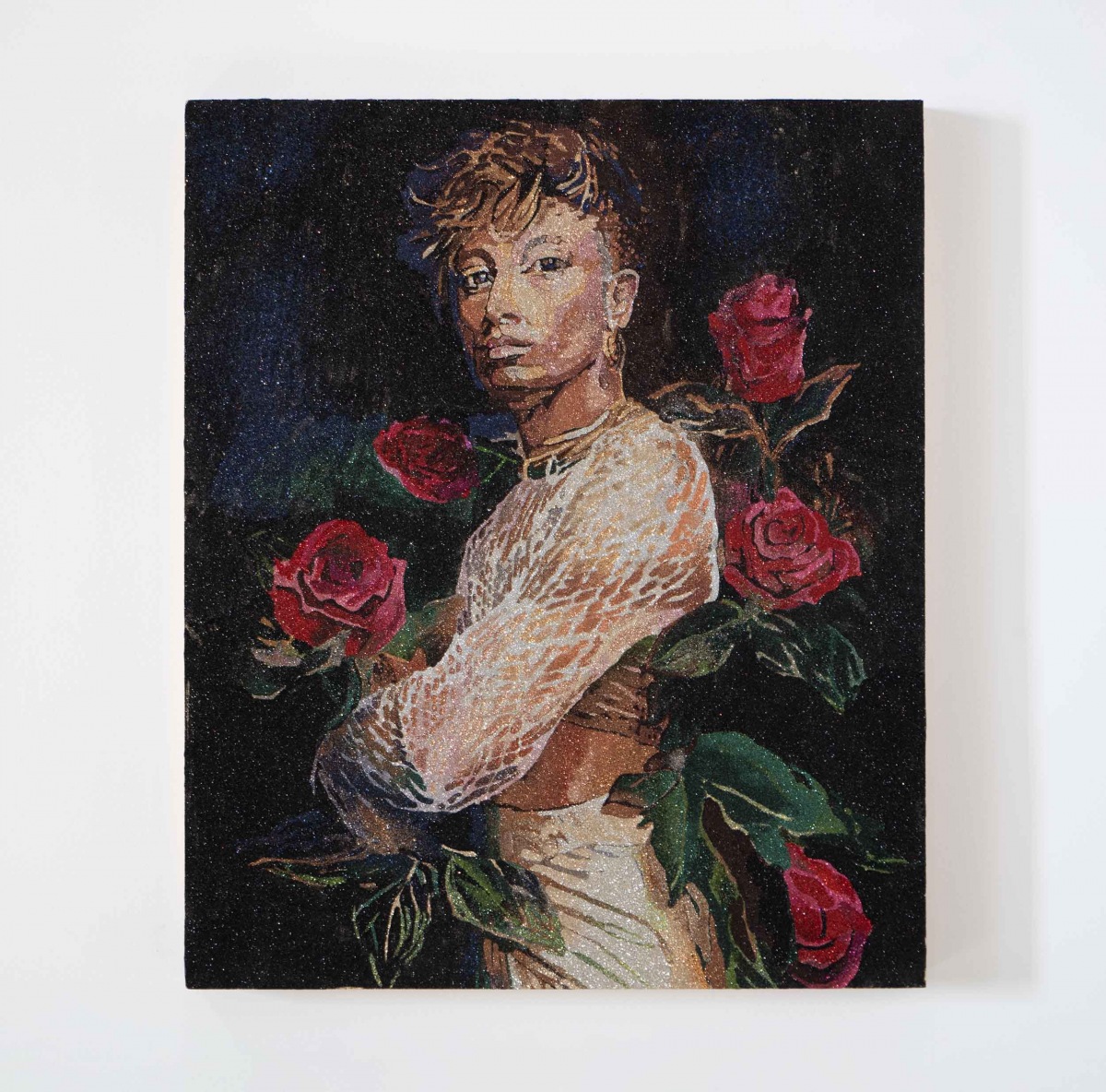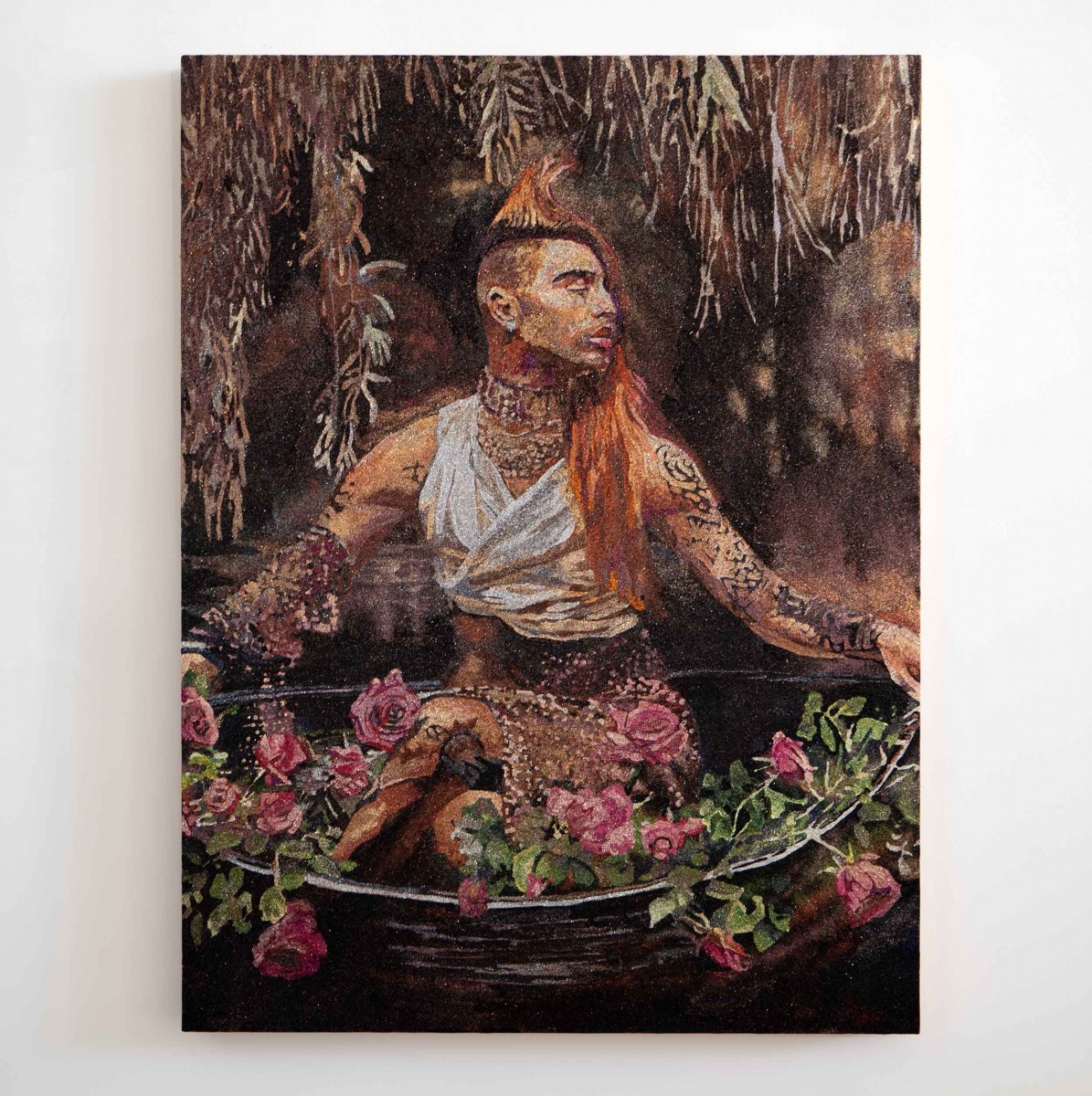 Known for her contemporary figurative “paintings” made entirely of bombastic bits of glitter and a little glue, Vasta reimagines art history with a queer lens. In her first exhibition Mustn’t in 2007, Vasta reframed Angela Carter’s feminist fairy tales depicting a mystical landscape where women with supernatural powers cavort in deadly play. Vasta’s second exhibition reflects the trophy portrait in glitter, this time with internet composites of adolescent females posed with their kill. Vasta then presented After Caravaggio – a contemporary reframing of Michelangelo Merisi da Caravaggio’s historic paintings where she posed her coterie of friends and colleagues with contemporary props, turning gender and context on end. After the Hudson River School positioned Vasta’s glitter on wood landscapes in the traditions of 19th century landscape painting. Now Vasta turns to the sensorial visuals of the Pre-Raphaelites in House of Roses, a celebration of trans, nonbinary, and genderfluid as icons of beauty, sensuality and self-possession as much at home in the natural world as voguing in the ballroom. Flowing drapery in luminous glitter mirror Vasta’s operatic revelry and imposing gravity. A Vision of Fiammetta, after Rossetti, is almost ambrosial, a stately genderfluid portrait, obliquely referencing the original painting by Dante Gabriel Rossetti (1898). Vasta’s Vision of Fiammetta strikes a direct, unyielding gaze, embraced by exquisite red roses in a deep verdant garden.