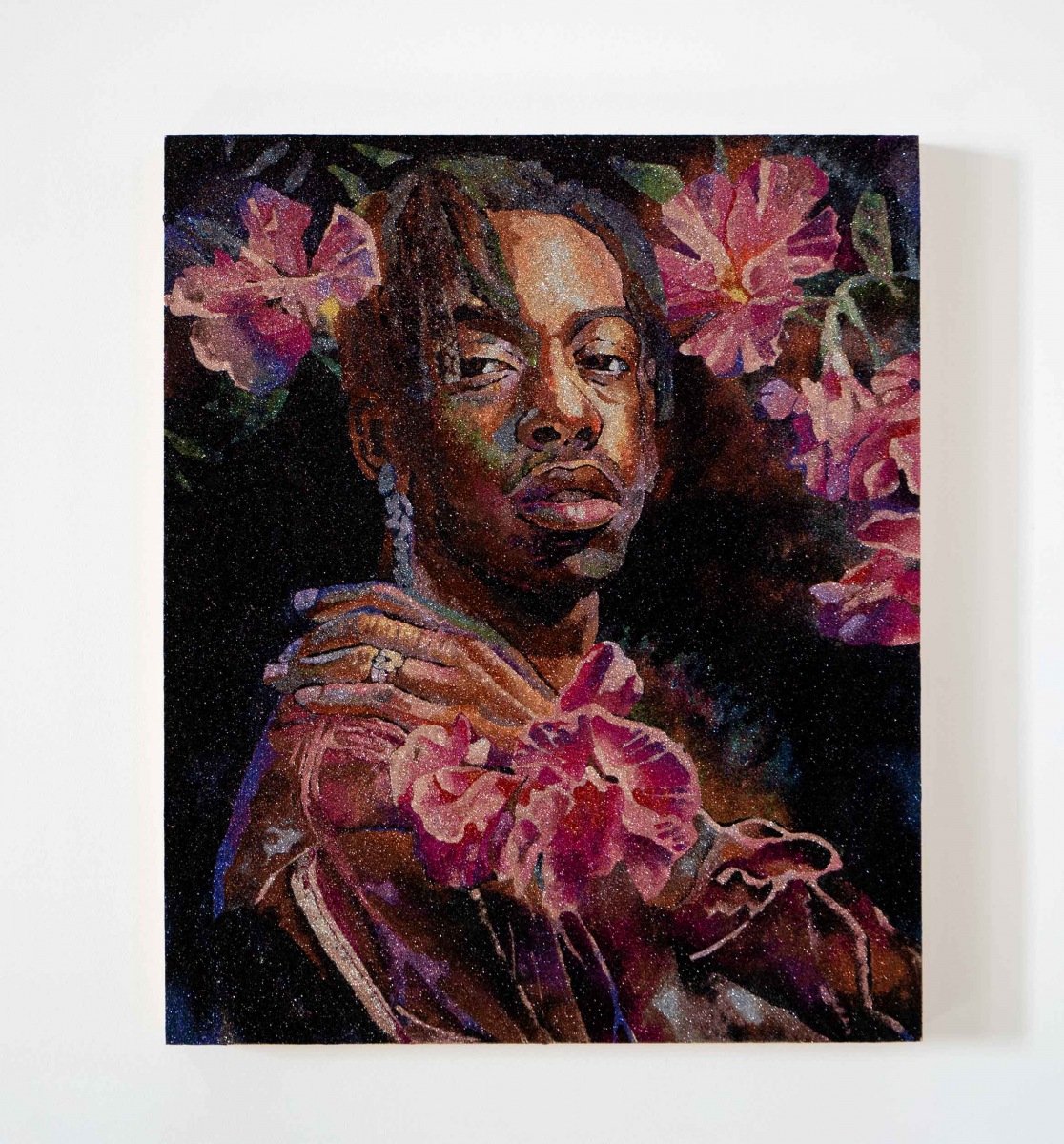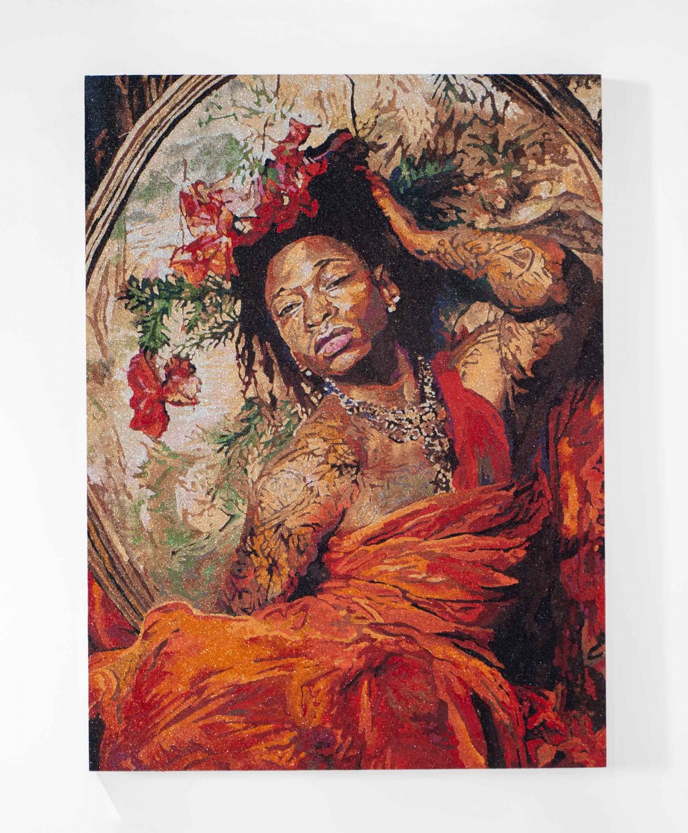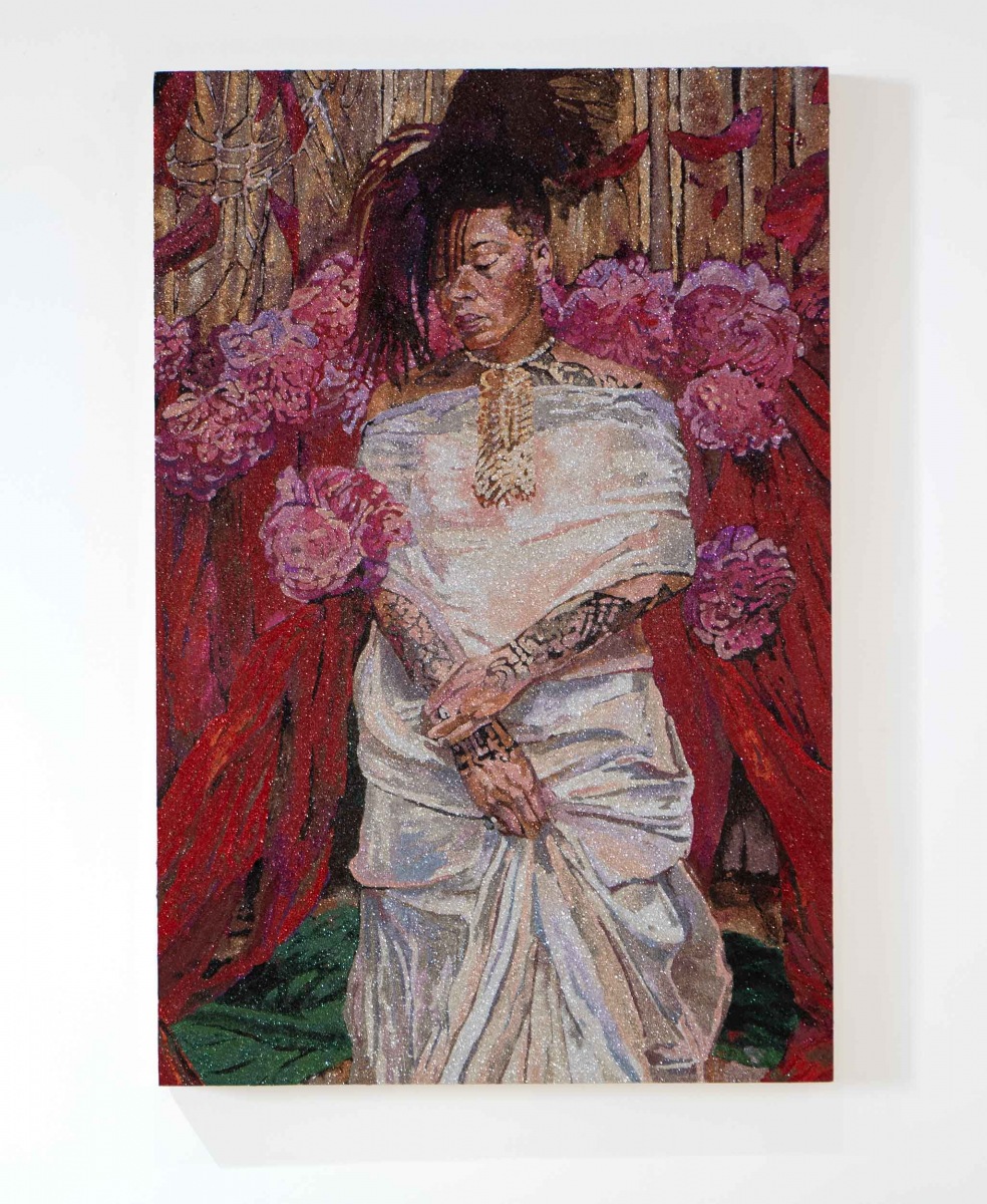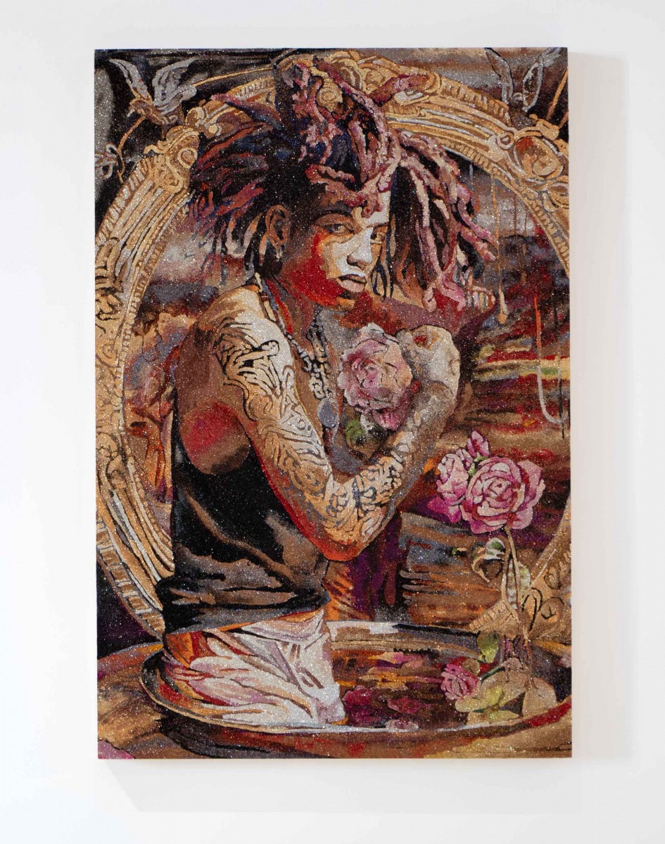 Known for her contemporary figurative “paintings” made entirely of bombastic bits of glitter and a little glue, Vasta reimagines art history with a queer lens. In her first exhibition Mustn’t in 2007, Vasta reframed Angela Carter’s feminist fairy tales depicting a mystical landscape where women with supernatural powers cavort in deadly play. Vasta’s second exhibition reflects the trophy portrait in glitter, this time with internet composites of adolescent females posed with their kill. Vasta then presented After Caravaggio – a contemporary reframing of Michelangelo Merisi da Caravaggio’s historic paintings where she posed her coterie of friends and colleagues with contemporary props, turning gender and context on end. After the Hudson River School positioned Vasta’s glitter on wood landscapes in the traditions of 19th century landscape painting. Now Vasta turns to the sensorial visuals of the Pre-Raphaelites in House of Roses, a celebration of trans, nonbinary, and genderfluid as icons of beauty, sensuality and self-possession as much at home in the natural world as voguing in the ballroom. Flowing drapery in luminous glitter mirror Vasta’s operatic revelry and imposing gravity. A Vision of Fiammetta, after Rossetti, is almost ambrosial, a stately genderfluid portrait, obliquely referencing the original painting by Dante Gabriel Rossetti (1898). Vasta’s Vision of Fiammetta strikes a direct, unyielding gaze, embraced by exquisite red roses in a deep verdant garden.