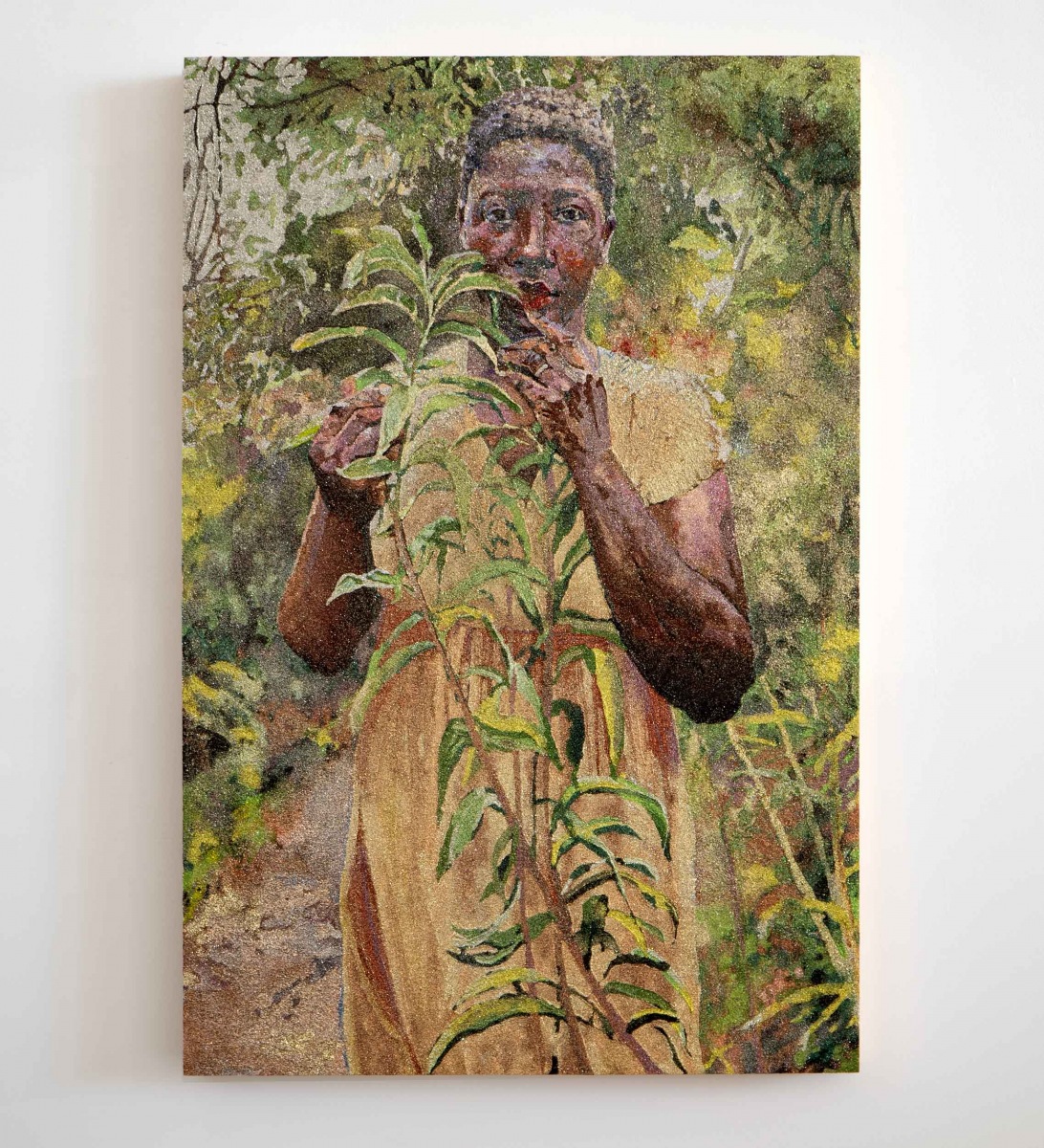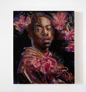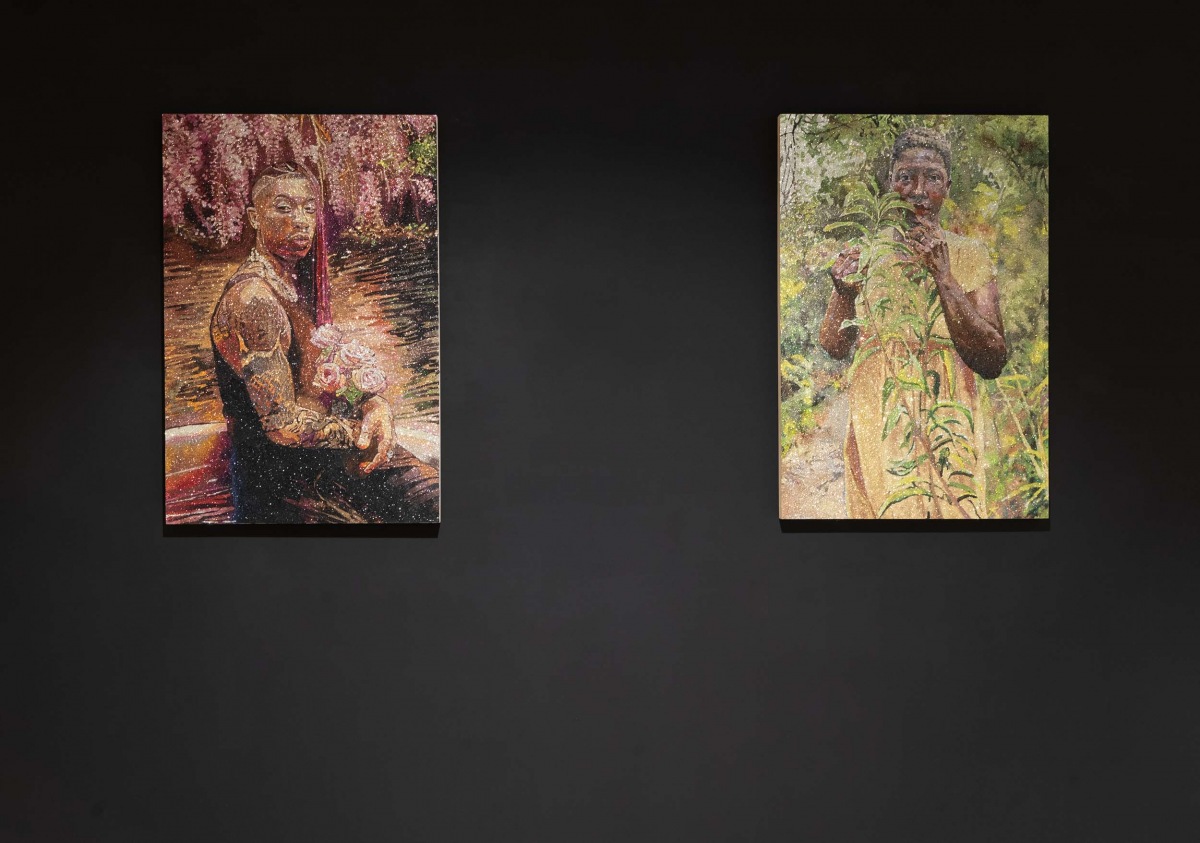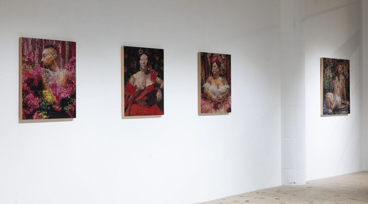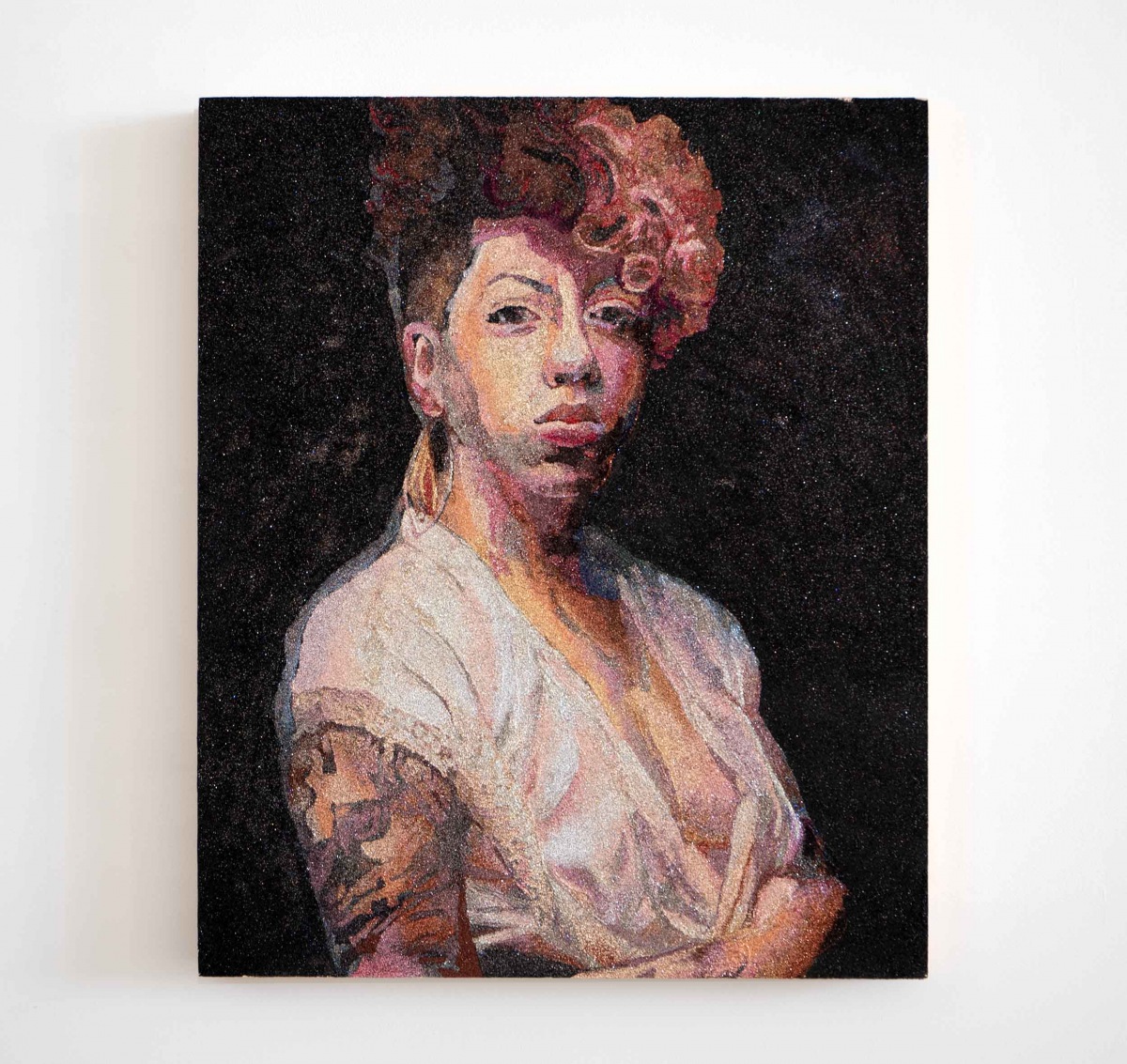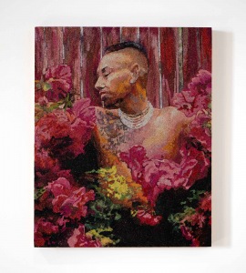 Known for her contemporary figurative “paintings” made entirely of bombastic bits of glitter and a little glue, Vasta reimagines art history with a queer lens. In her first exhibition Mustn’t in 2007, Vasta reframed Angela Carter’s feminist fairy tales depicting a mystical landscape where women with supernatural powers cavort in deadly play. Vasta’s second exhibition reflects the trophy portrait in glitter, this time with internet composites of adolescent females posed with their kill. Vasta then presented After Caravaggio – a contemporary reframing of Michelangelo Merisi da Caravaggio’s historic paintings where she posed her coterie of friends and colleagues with contemporary props, turning gender and context on end. After the Hudson River School positioned Vasta’s glitter on wood landscapes in the traditions of 19th century landscape painting. Now Vasta turns to the sensorial visuals of the Pre-Raphaelites in House of Roses, a celebration of trans, nonbinary, and genderfluid as icons of beauty, sensuality and self-possession as much at home in the natural world as voguing in the ballroom. Flowing drapery in luminous glitter mirror Vasta’s operatic revelry and imposing gravity. A Vision of Fiammetta, after Rossetti, is almost ambrosial, a stately genderfluid portrait, obliquely referencing the original painting by Dante Gabriel Rossetti (1898). Vasta’s Vision of Fiammetta strikes a direct, unyielding gaze, embraced by exquisite red roses in a deep verdant garden.