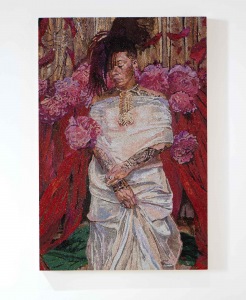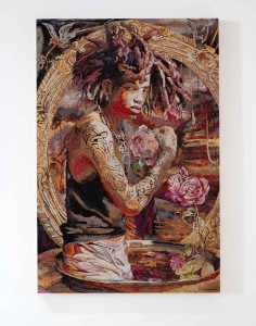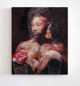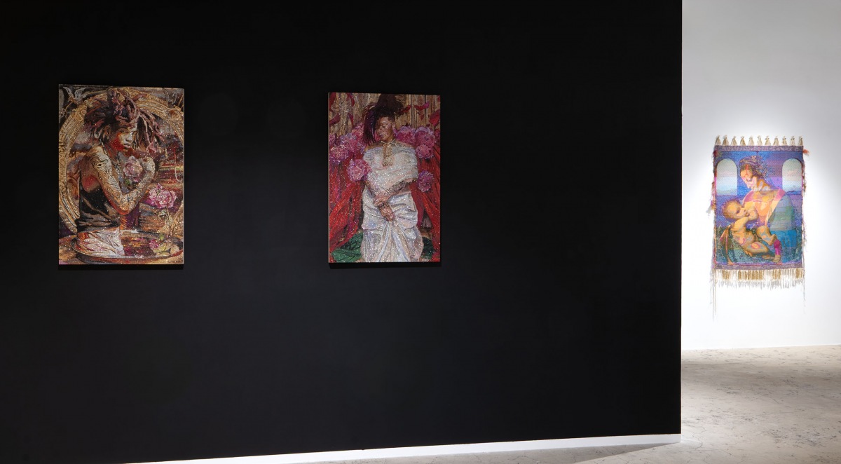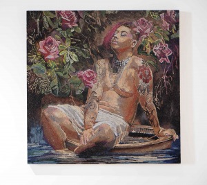 It’s a pleasure to present our upcoming solo exhibitions of John Paul Morabito—Our Lady of the Bathhouse and Jamie Vasta—House of Roses. The pairing of their one-person exhibitions provides the viewer an opportunity to delve into each artists’ remediation of art history through their respective media as they subvert treasured iconic paintings. Using nontraditional materials (Jamie Vasta, glitter and glue; John Paul Morabito, weaving and beads), they redress classical imagery with the aim of empowering those removed from the annals of art history.