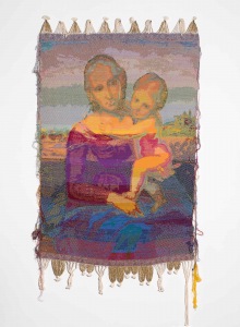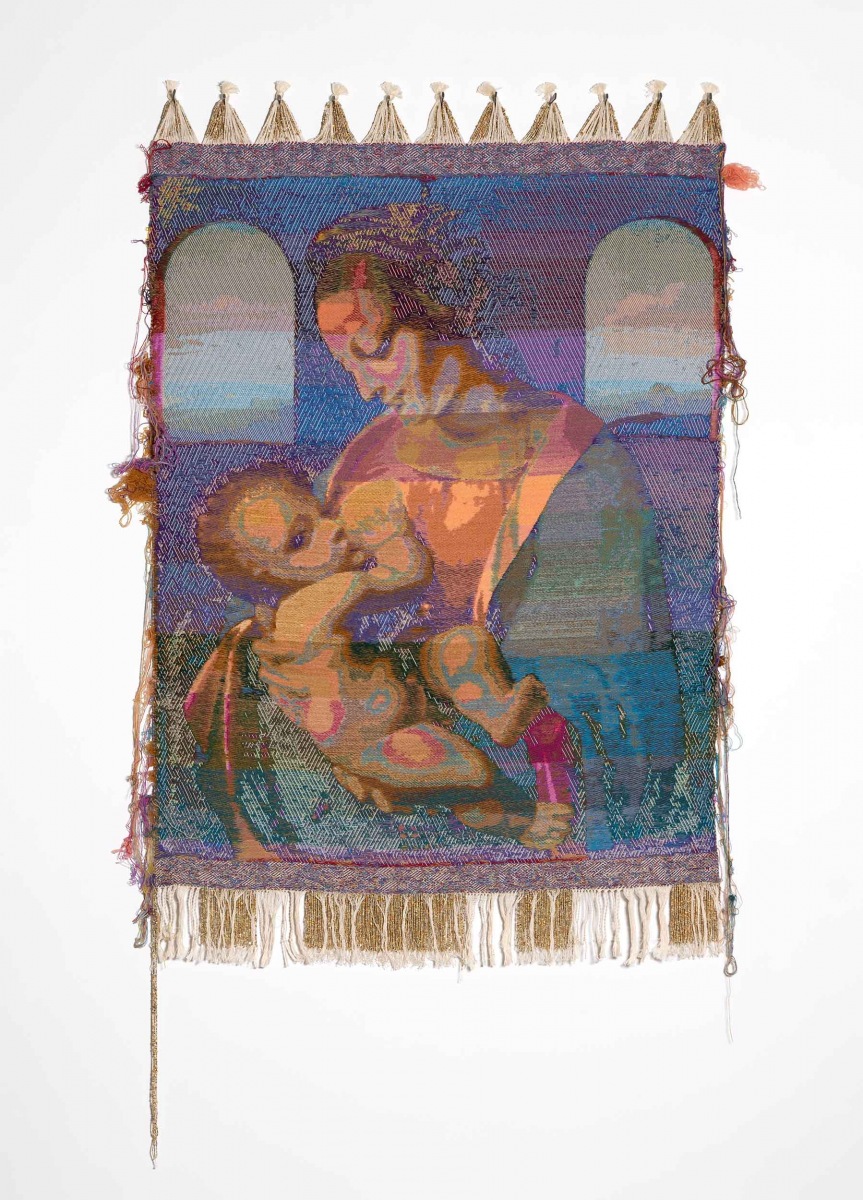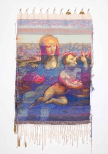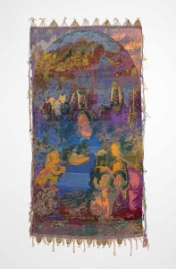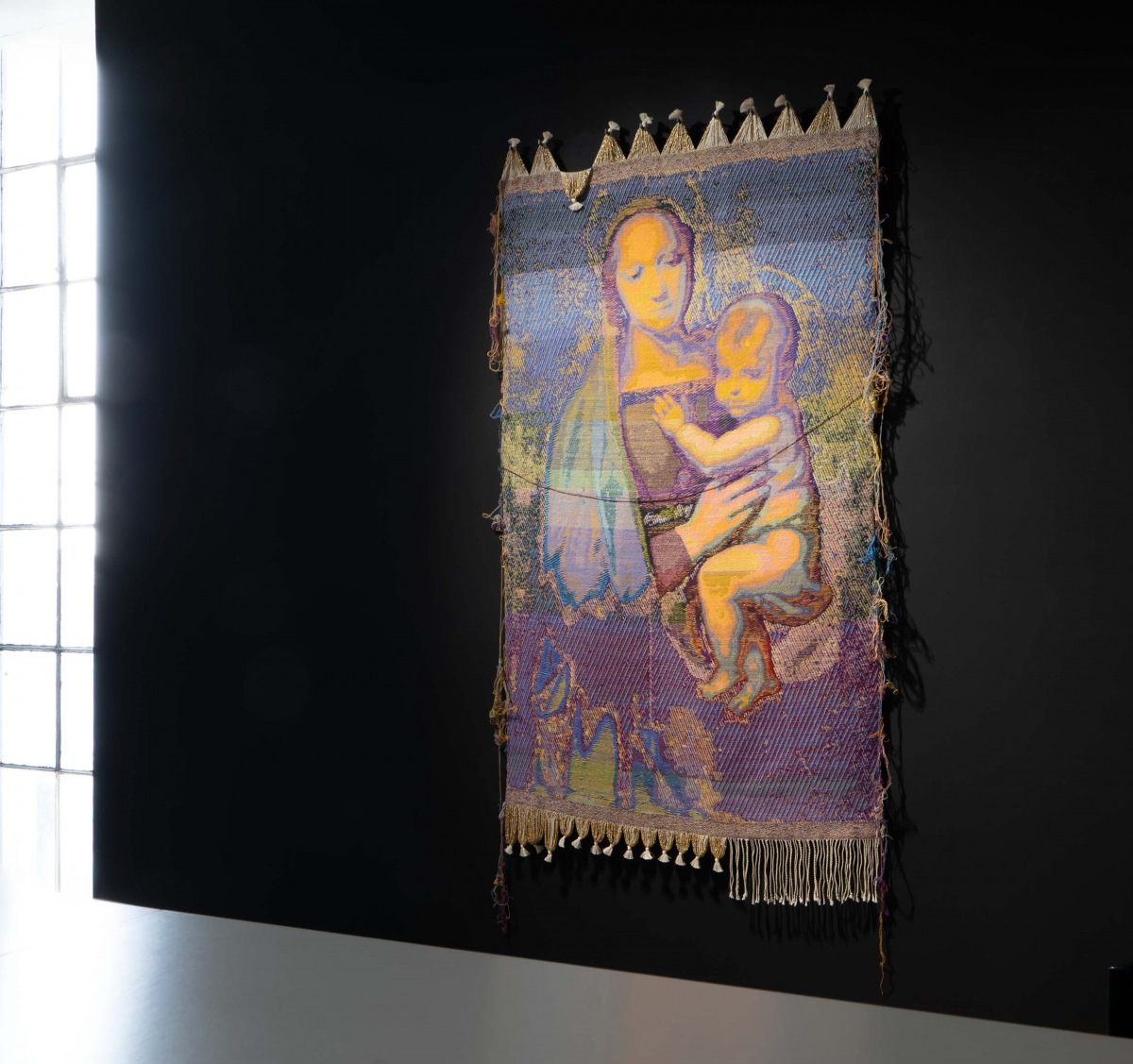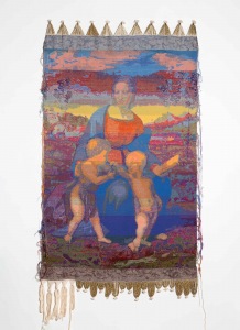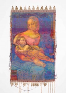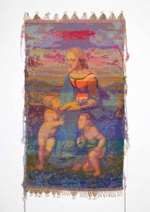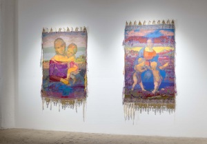 Presenting this extraordinary series offers more than a window into Morabito’s life and studio practice, it reveals an effective propaganda tool of early church and state: tapestries. Begun in 2018 and completed in 2020, Morabito unveils their series of religious tapestries with a subtle but explicit intervention, cloaking 15th- and 16th-century Renaissance paintings of Madonna and Child in flamboyant colors of drag—a Queer allegory turning sacred to Camp. Morabito remediates devotional paintings by artists such as DaVinci and Botticelli with accentuated day-glow colors and a stigmata presentation shimmering with gold beaded fringe. With this joyful celebration of sensorial imaginings, Morabito deftly reframes and reclaims the historic stigmatization and hypocrisy of the Catholic Church through queer transubstantiation. The best blasphemy is a slow burn.