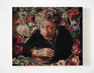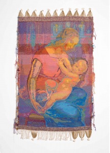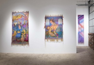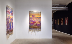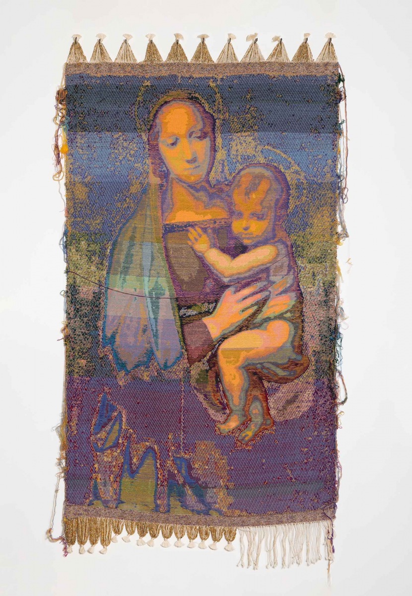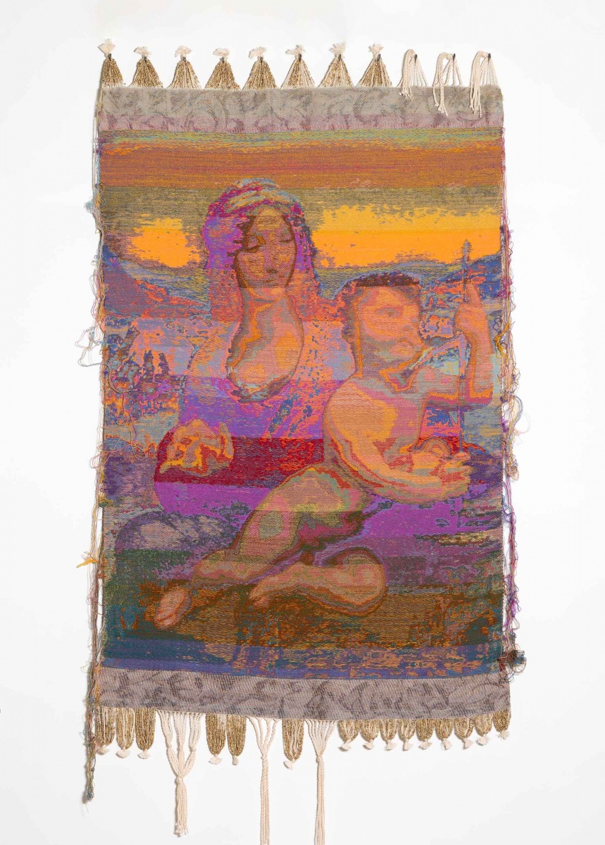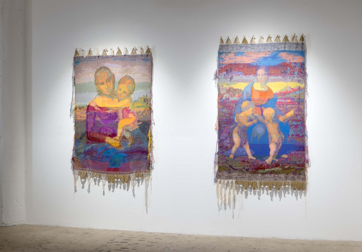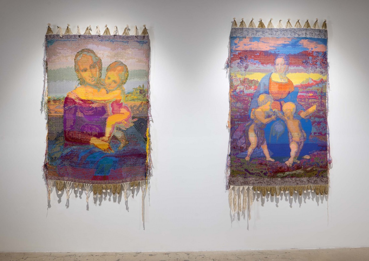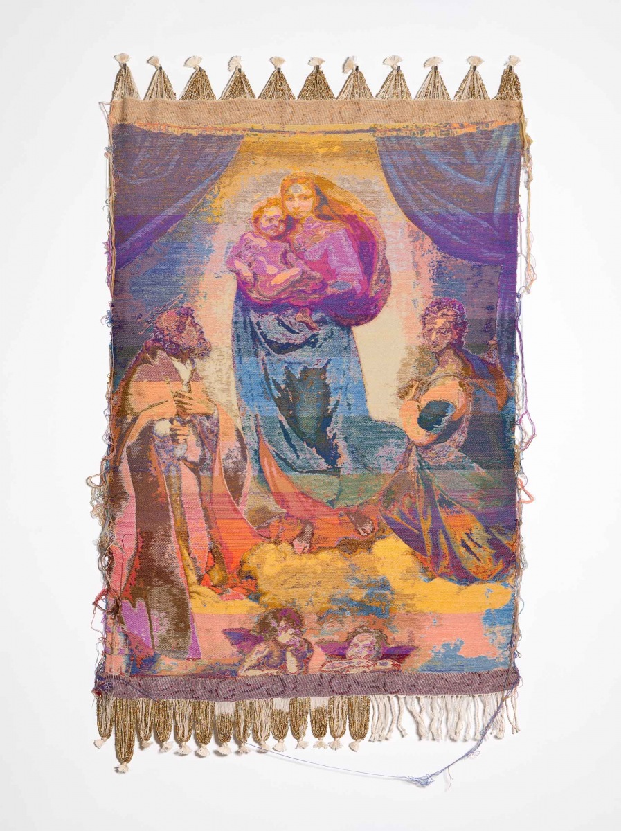 PATRICIA SWEETOW GALLERY is thrilled to present Our Lady of the Bathhouse, beaded jacquard tapestries by John Paul Morabito. Morabito spent their early formative years in the Bronx, more specifically in the Bronx of the immigrant Italian-American community. This milieu provided an environment resplendent with cultural particularities, memories of religious icons dotting walls and tables, heavy perfumes, scents from candles and cooking wafting through the air, lavish brocade and fringed furniture encased in plastic (stand-ins for liturgical garments), plastic runners shielding rugs from human presence, heavy mahogany-stained wood tables, and, of course, on the personal side, big hair, leopard prints, oversized gold jewelry, painted nails, false eyelashes, cigars, polyester everything, and gesticulating robust conversations. Every ethnicity has its own Bronx, this landscape of experience has been the stuff of film, writing, and art for generations, continuing today. And thus it’s true of Morabito, the perfect petri dish birthed from the very icons that shaped the cultural imagination of their youth. This visual landscape is mirrored in their tapestries and, with a shimmer and a wink, exaggerated through campy drag decadence.