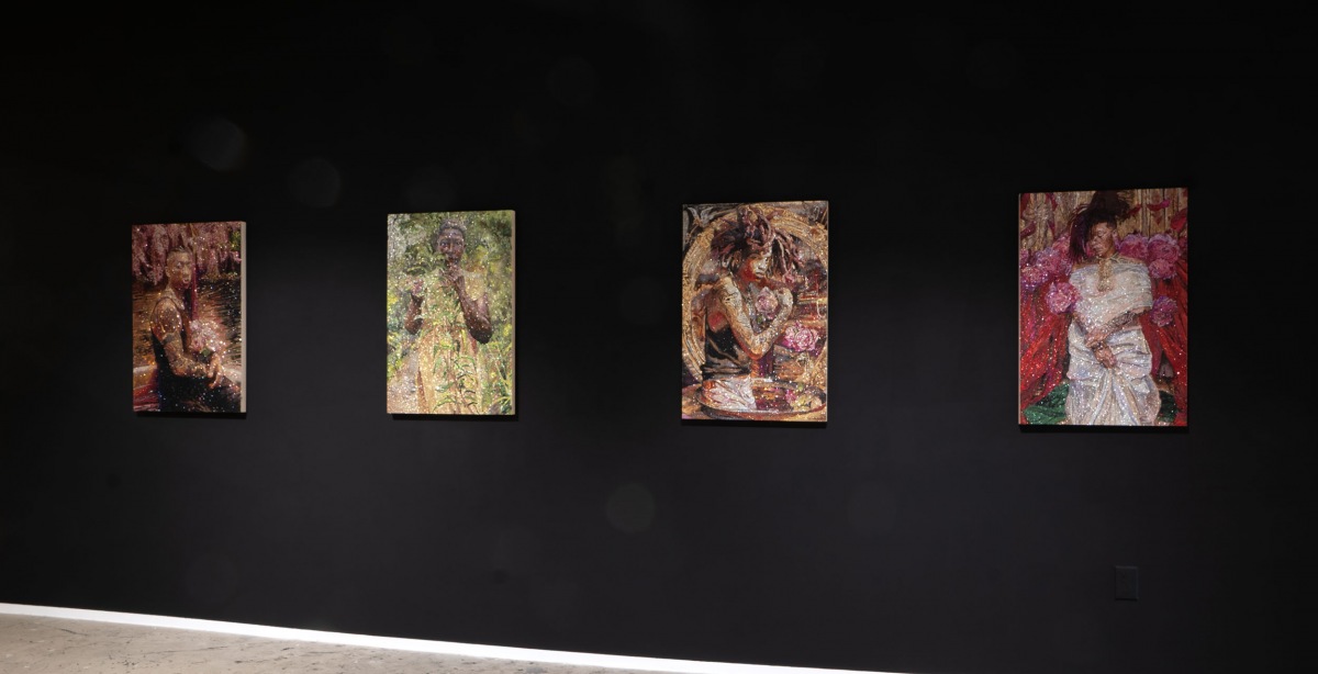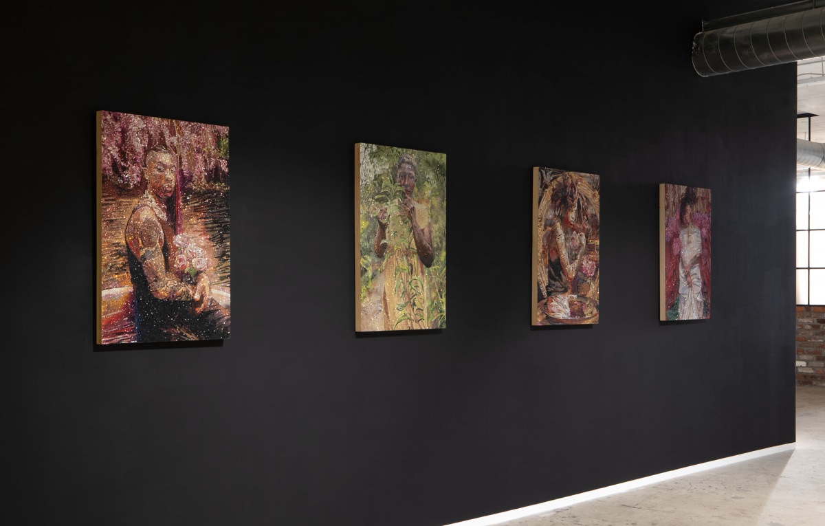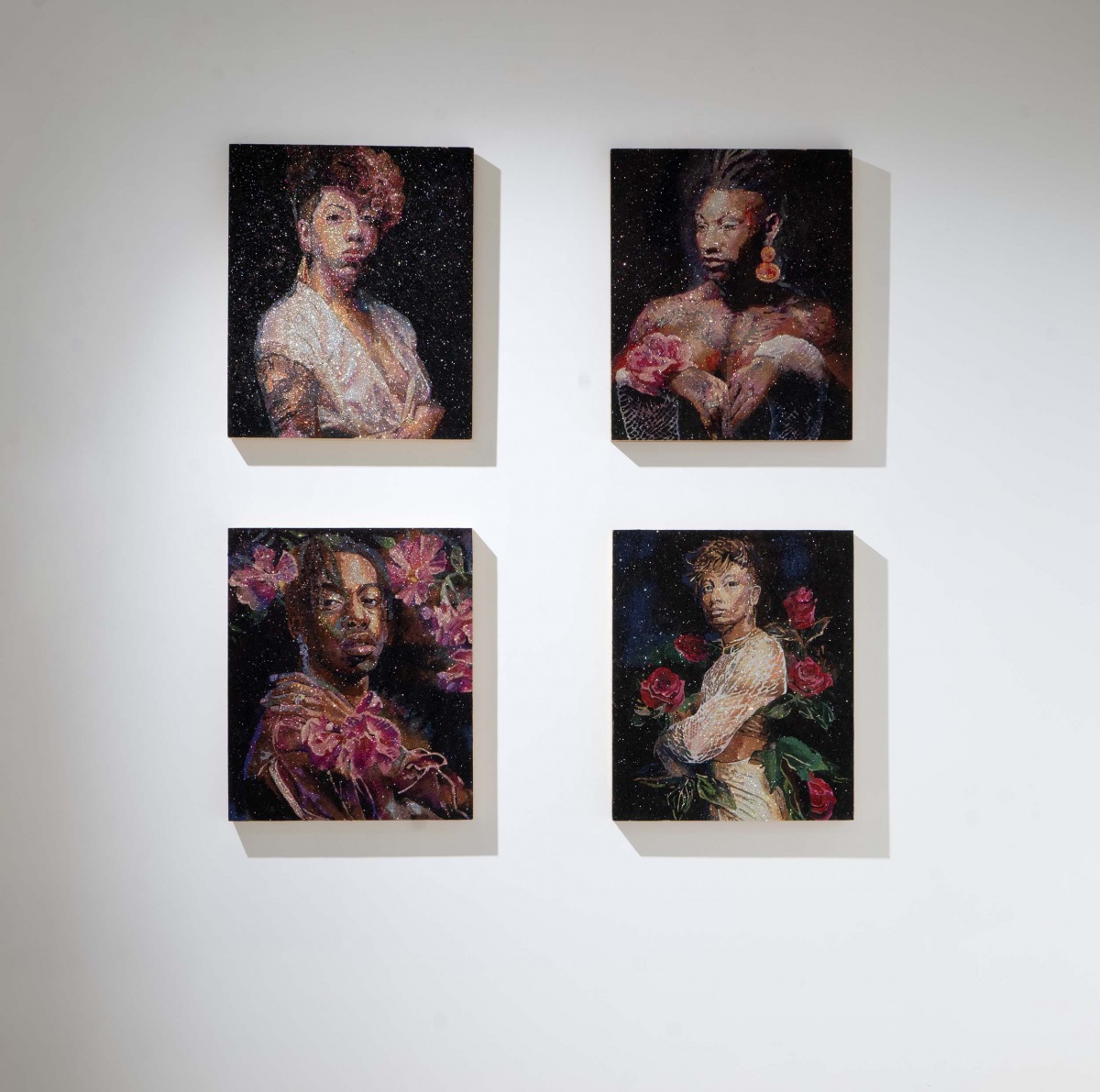 Ballroom culture as imagined through 19th-century Pre-Raphaelite paintings is front and center in Jamie Vasta’s exhibition, House of Roses, a celebration of the shimmering, diverse expressions of queer identity. The composite glitter portraits draw inspiration from the opulence, bearing, and metaphor found in Pre-Raphaelite paintings. Rousing in lush outdoor environs and restaged with queer identities in full bloom, Vasta’s ficitve family are gorgeous, tattooed, costumed, commanding and heralded by community—they refuse the lassitudes of erasure and closeted thinking.