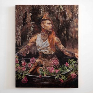The subjects of my paintings are a diverse group of tattooed, genderfluid individuals who defy traditional notions of beauty and representation. By positioning these figures as the focal point of my reinterpretation of Pre-Raphaelite imagery, I challenge the historical tropes that have often sidelined those who fall outside normative definitions of gender and beauty. The lush floral motifs represent not just the natural world but also the flourishing of diverse identities and experiences. They serve as a reminder of the strength found in community and the importance of nurturing oneself and others.