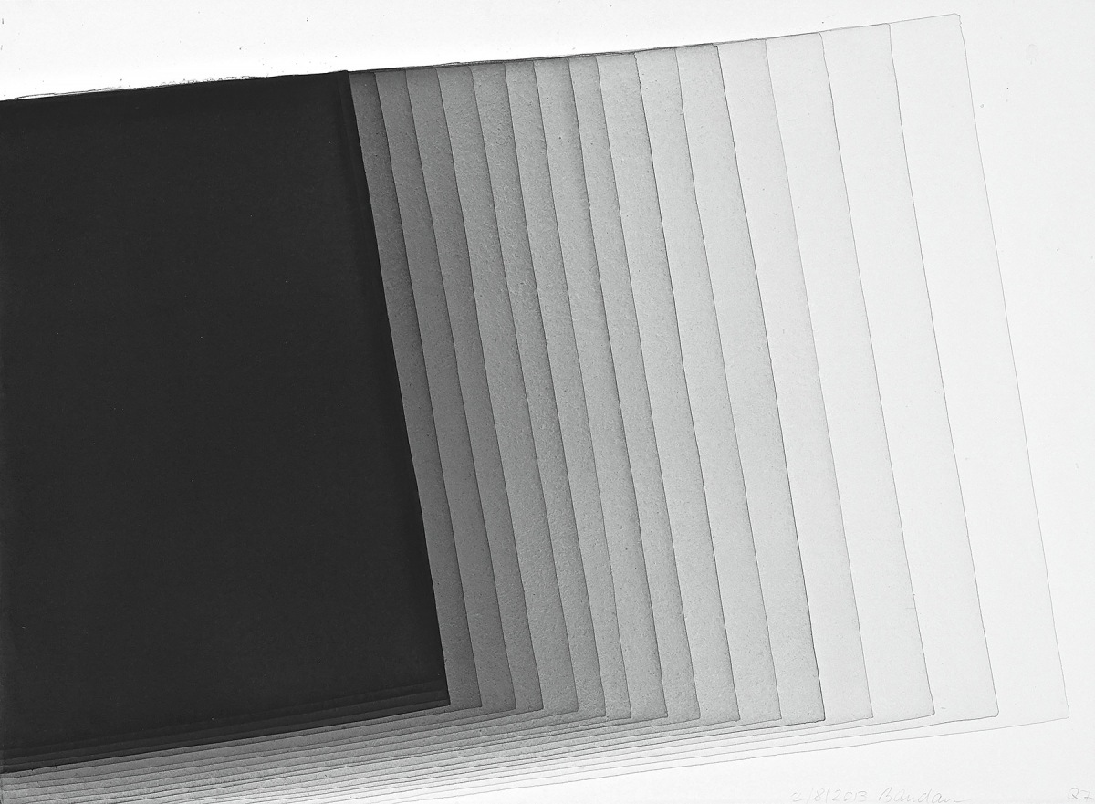 Using only black pigments, Bandau starts a series of paintings with a herculean session lasting many hours, brushing layer by layer, light to dark and edge to edge. Because the paintings dry between each application of pigment, the rhythmic accretion of layers takes months, if not years to resolve. Kenneth Baker, writing for the San Francisco Chronicle, said of Bandau, “No one unfamiliar with watercolor should underestimate the feats of control that pieces such as this record. Just the right decisions regarding tools, materials and timing have to be sustained to achieve the look of effortless perfection Bandau gets.”