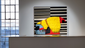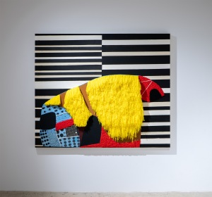 Upon first glance it’s easy to mistake Amos’s 2D works for paintings, but upon close inspection they quickly dissolve into deeply textured, layered textile works. Defying classification, Sarah Amos’s large-scale mixed media works are more than the sum of their parts. A complex brew of dying, printing, stitching, sewing and layering – impossible for those less skilled, but in her hands, masterfully combined. She mimes the realm held sacred for painters, deftly composing mixed media works that found early inspiration from Hokusai’s ghost prints, Kabuki Theater, African ritual dress and sacred objects. Her innovation in print media has allowed Sarah to pursue media outside the constraints of a single-minded approach.