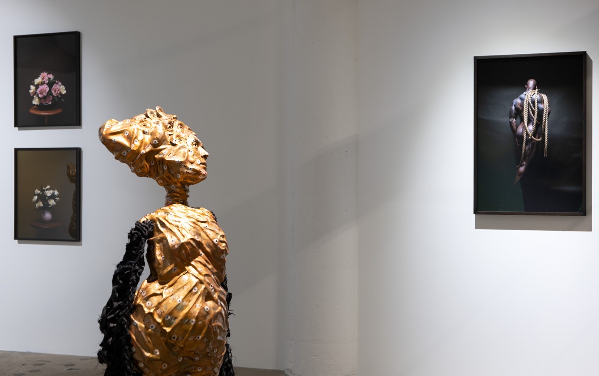 Ballroom culture as imagined through 19th-century Pre-Raphaelite paintings is front and center in Jamie Vasta’s exhibition, House of Roses, a celebration of the shimmering, diverse expressions of queer identity. The composite glitter portraits draw inspiration from the opulence, bearing, and metaphor found in Pre-Raphaelite paintings. Rousing in lush outdoor environs and restaged with queer identities in full bloom, Vasta’s ficitve family are gorgeous, tattooed, costumed, commanding and heralded by community—they refuse the lassitudes of erasure and closeted thinking.