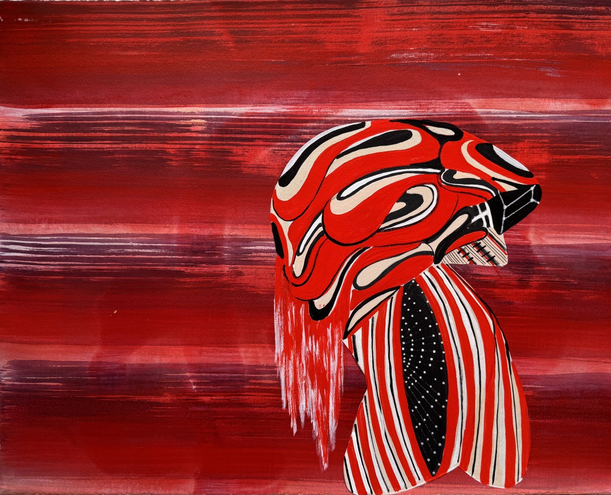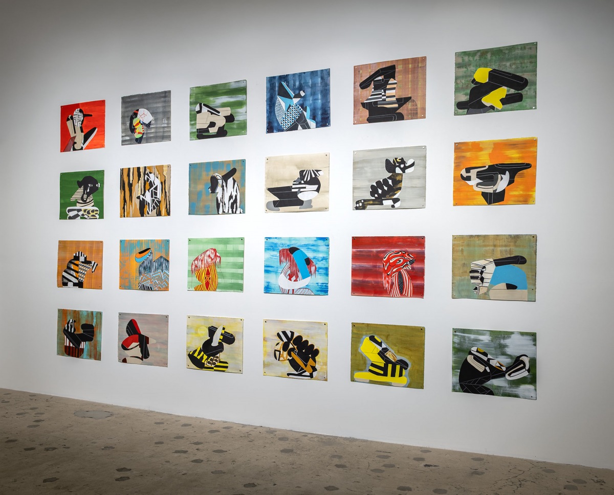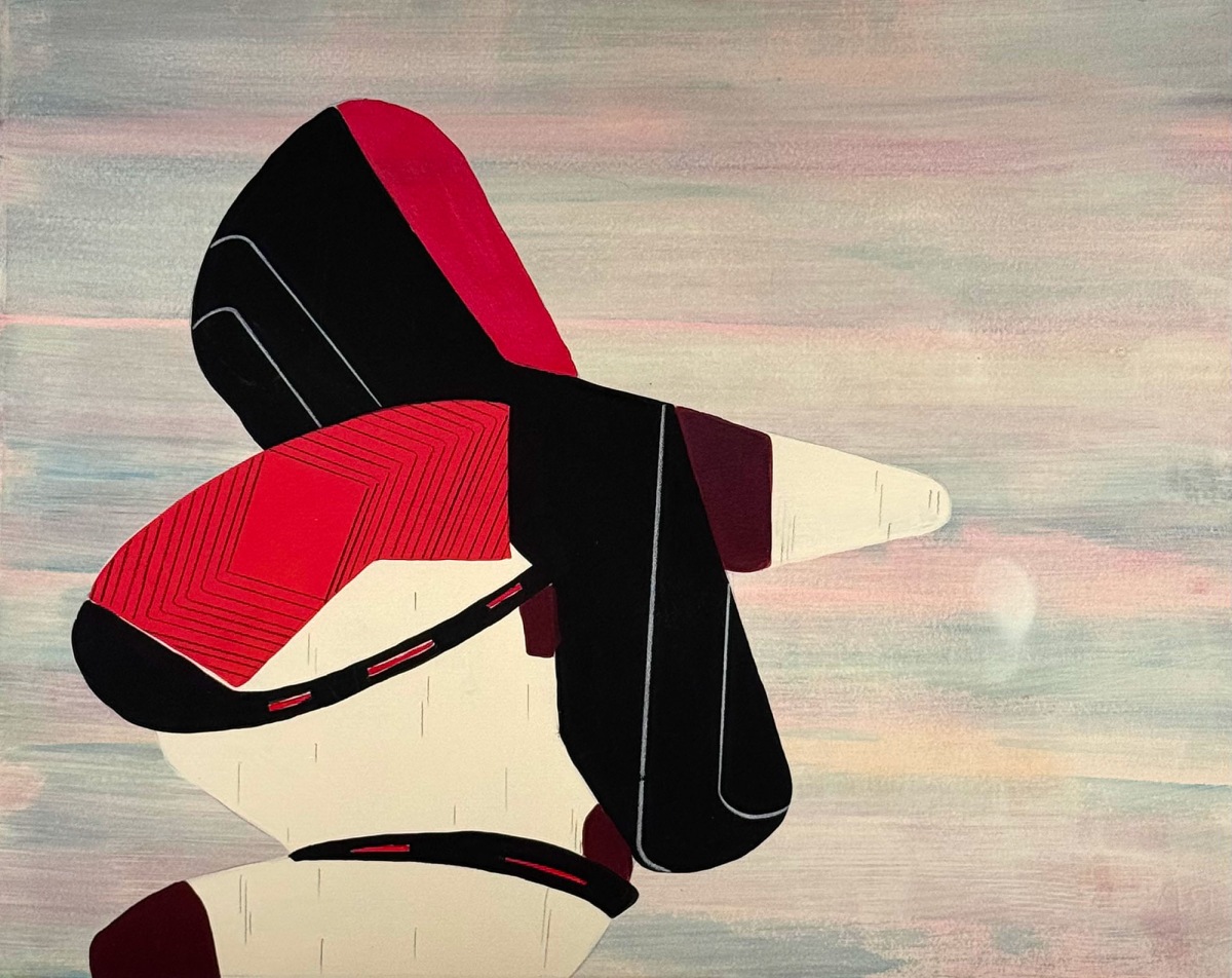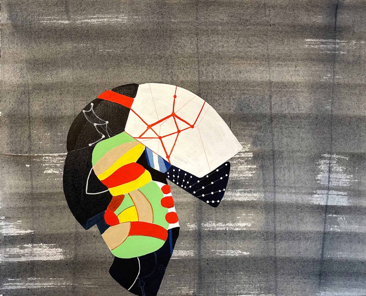 Sarah Amos is a master printmaker who defies the traditions of printmaking; instead, she explores the opulent hand and texture of textiles. Drawing on the influence of Japanese prints, architecture, and the graphic symbolism and movement of manga, Amos has developed a body of work that pushes printmaking into a richer, more expansive terrain. Her process begins with sketches in a sketchbook, which she develops into 16 × 20 inch gouache drawings on paper, typically made in groups of six, allowing forms, colors, and patterns to evolve in conversation with one another. From the 50 to 60 drawings she produces each year, only a small number are translated into large-scale textiles, each selected for its resonance and ability to hold the weight of that transformation.