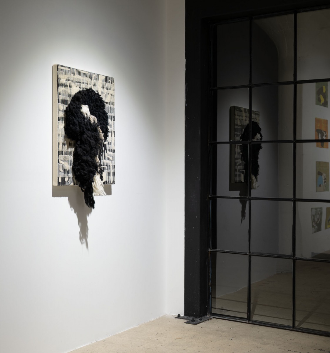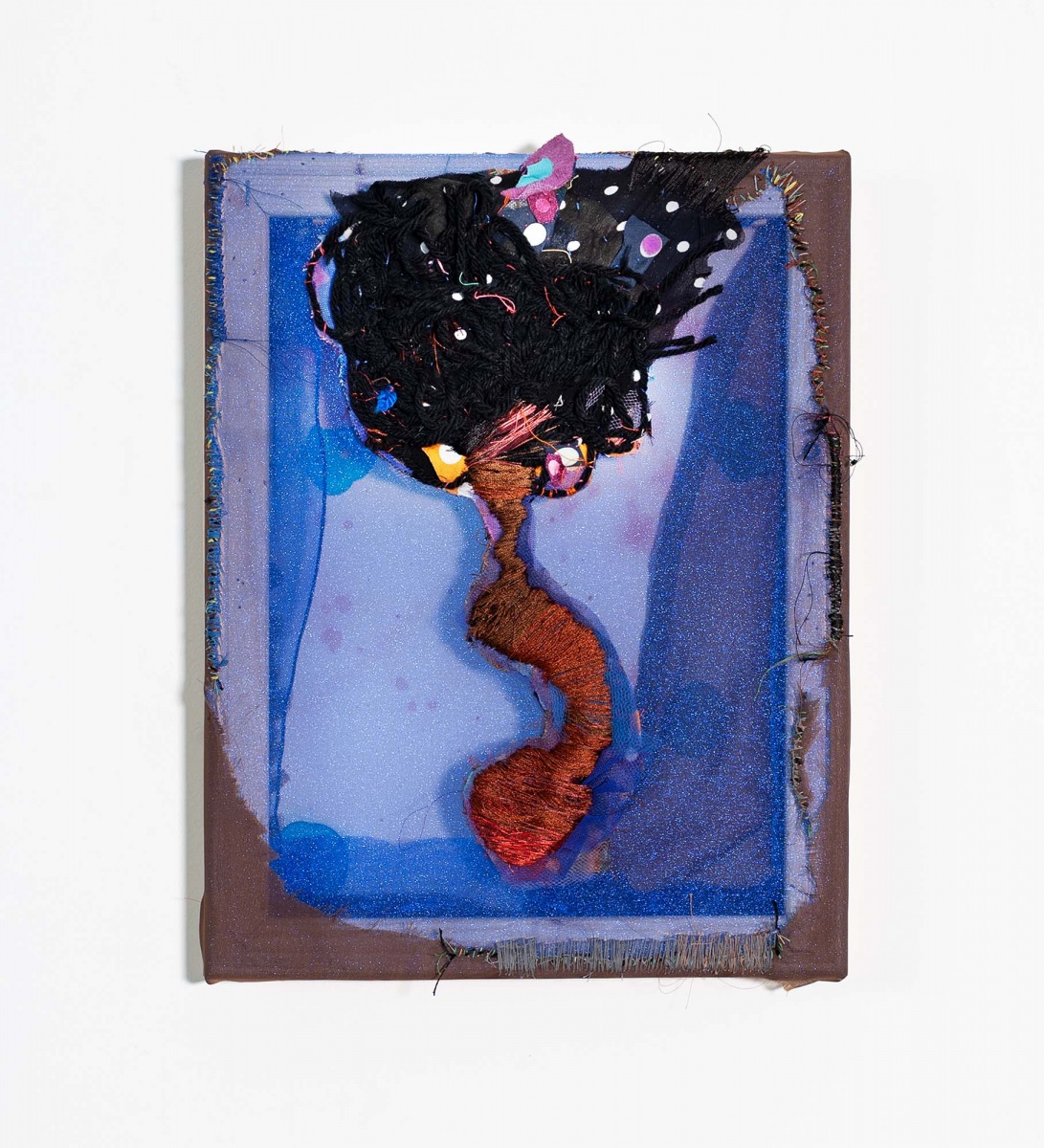 The final iteration is a unique mixed media hybrid textile ‘painting’, requiring a one-thousand-pound press. Amos drives acrylic ink deep into the tooth of the material surface, creating a soft, velvety ground that she layers with yarn and stitching. In these hybrid works, thread does not simply sit on top of the printed image; it extends and activates it, intensifying the relationship between color, background, surface, and sculptural form. With more than 30 years of experience in printmaking, she’s developed a multivariant approach that brings together an understanding of fine art printing, stitching, appliqué, and collage in singular compositions that are at once unconventional, tactile, and painterly.
