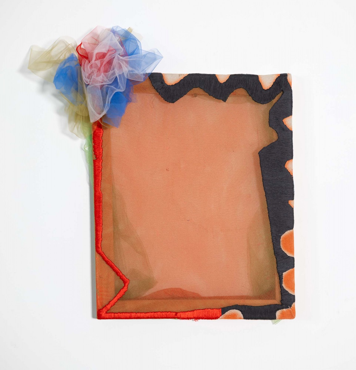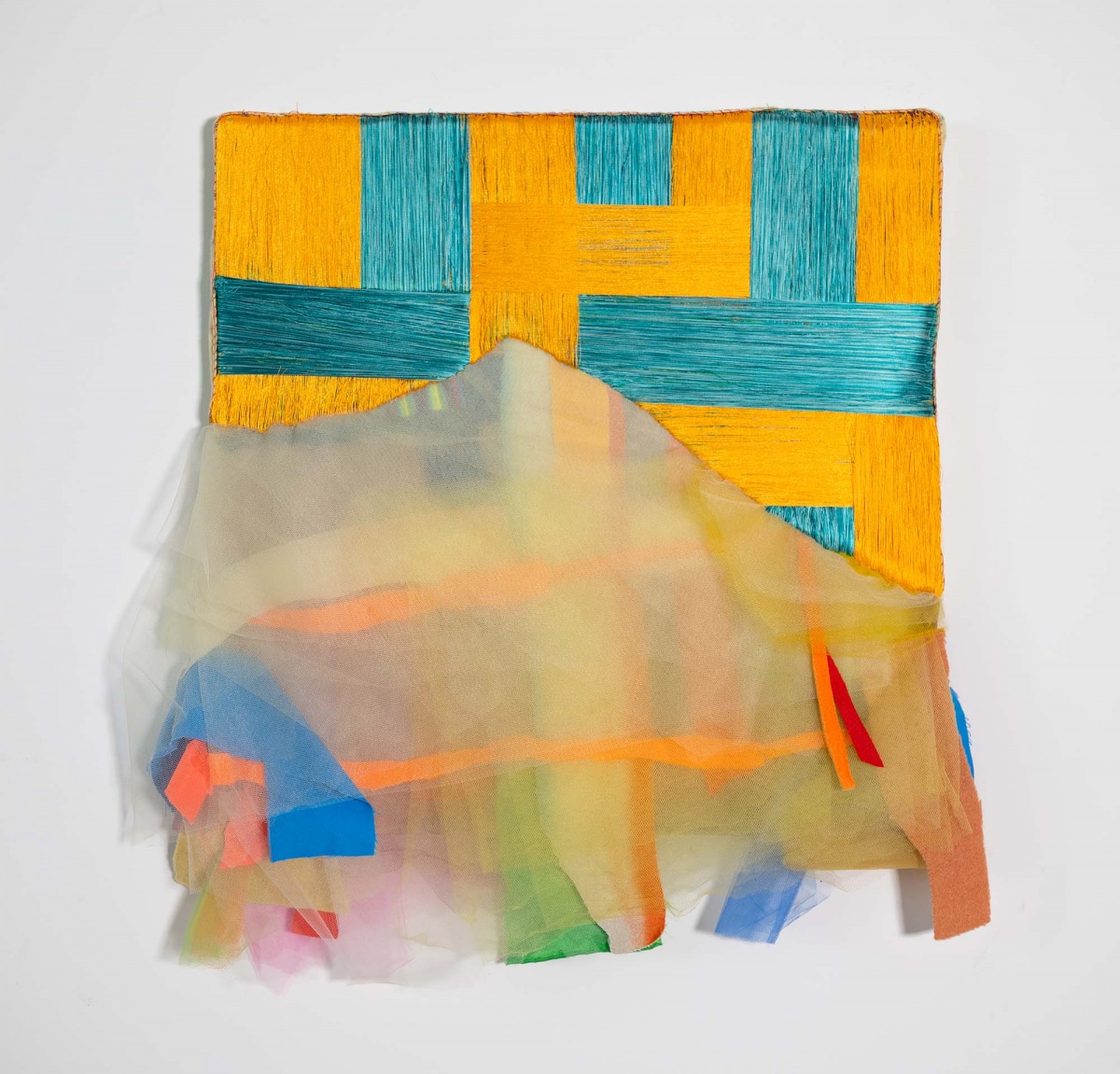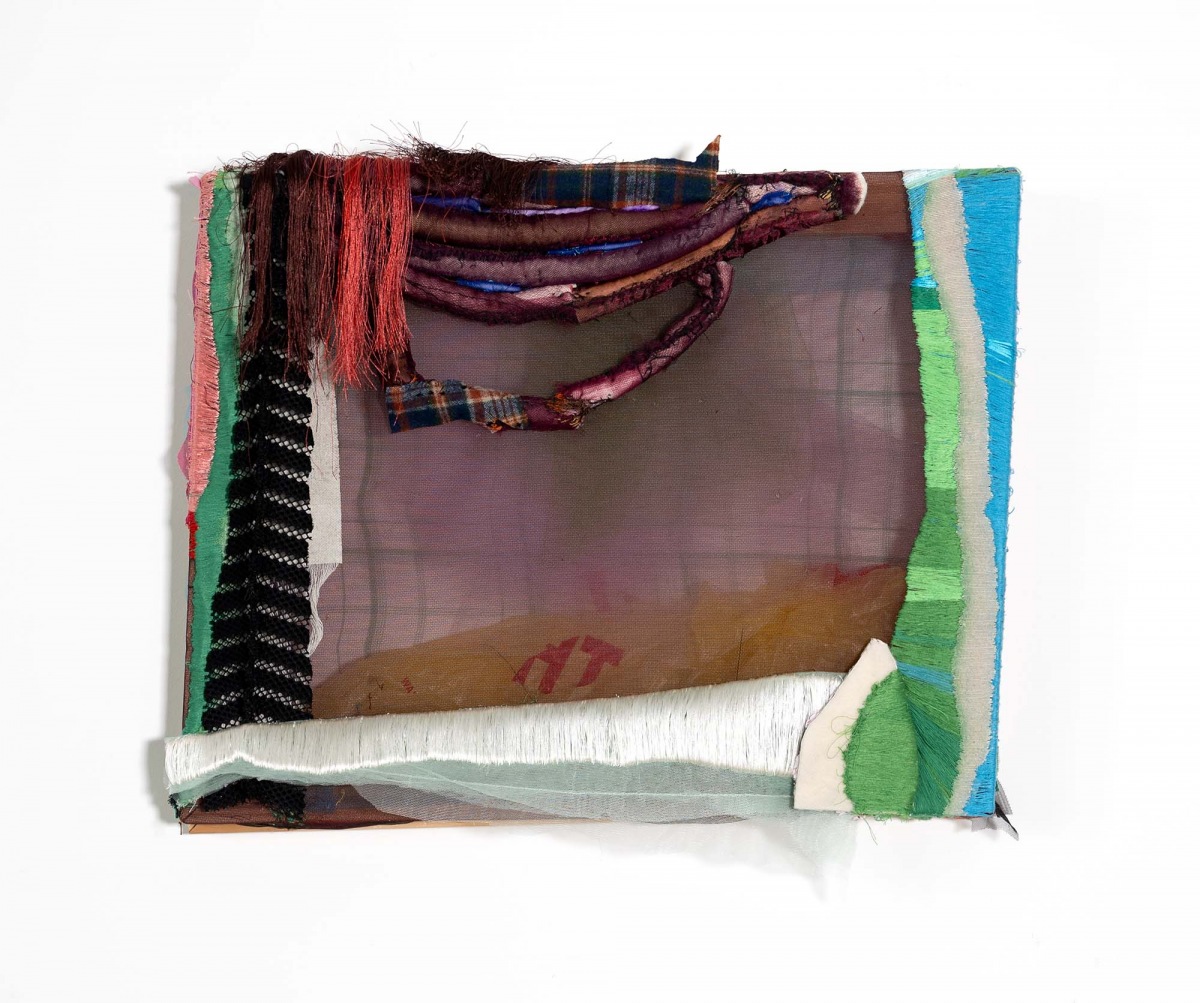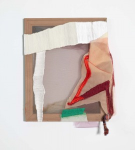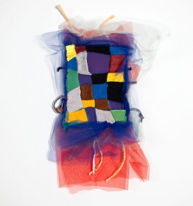 Fabric remnants, paper, wood scrap, thread, bits of hardware and discarded notions from consumer culture accumulate energy and presence as she stitches, bundles, cuts, recuts, patches, layers and folds – sorting possibilities while watching for a move. Tulle is foundational to Couzens’s constructions. She uses it like paint, its transparency and nuanced palette kindle the senses, sending shivers that deliberately undermine Date Night notions of femininity. It’s a fragile medium, but heaviness and density can be felt; identities dissolve into pure form, color fields float and flow, calling