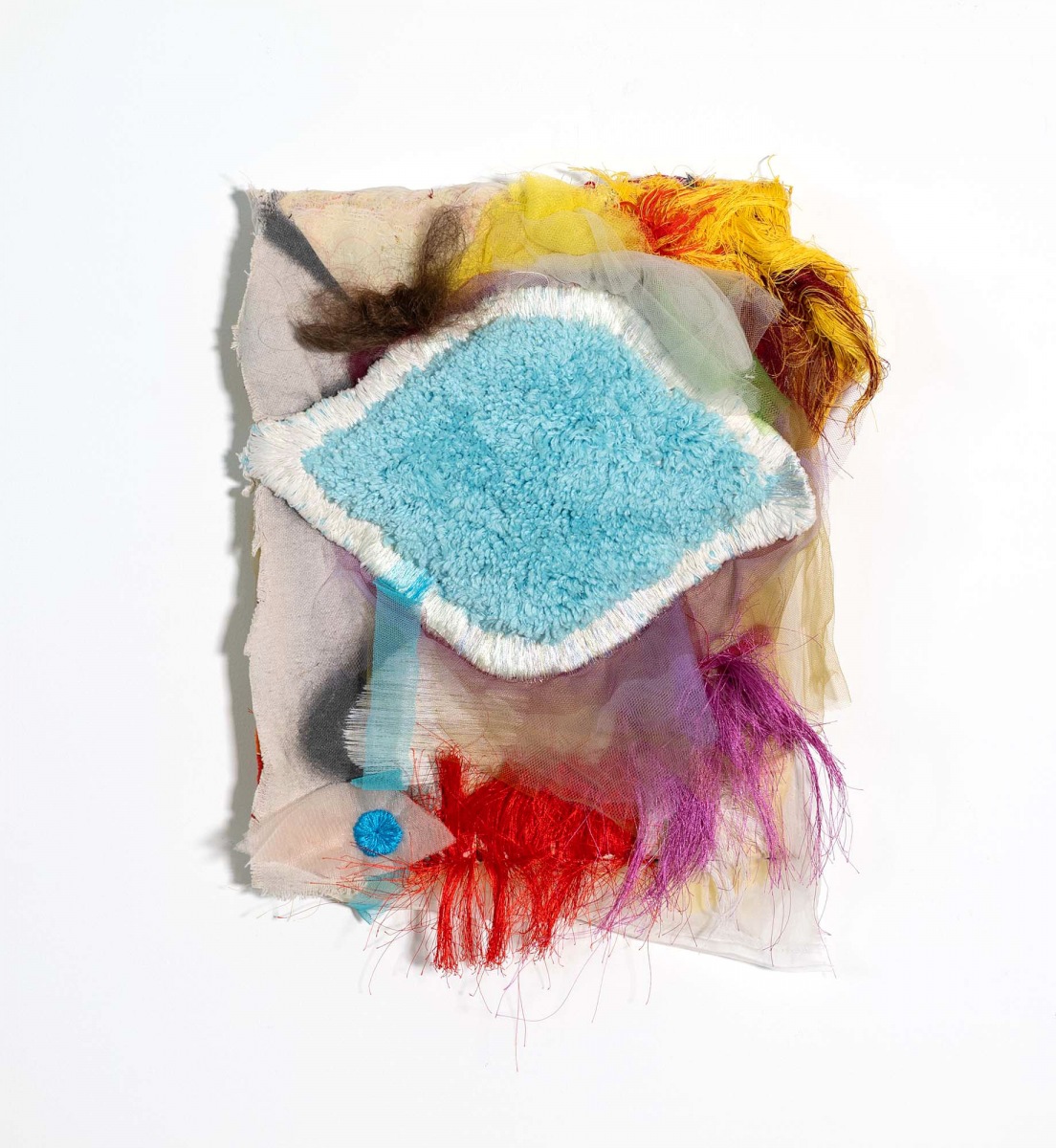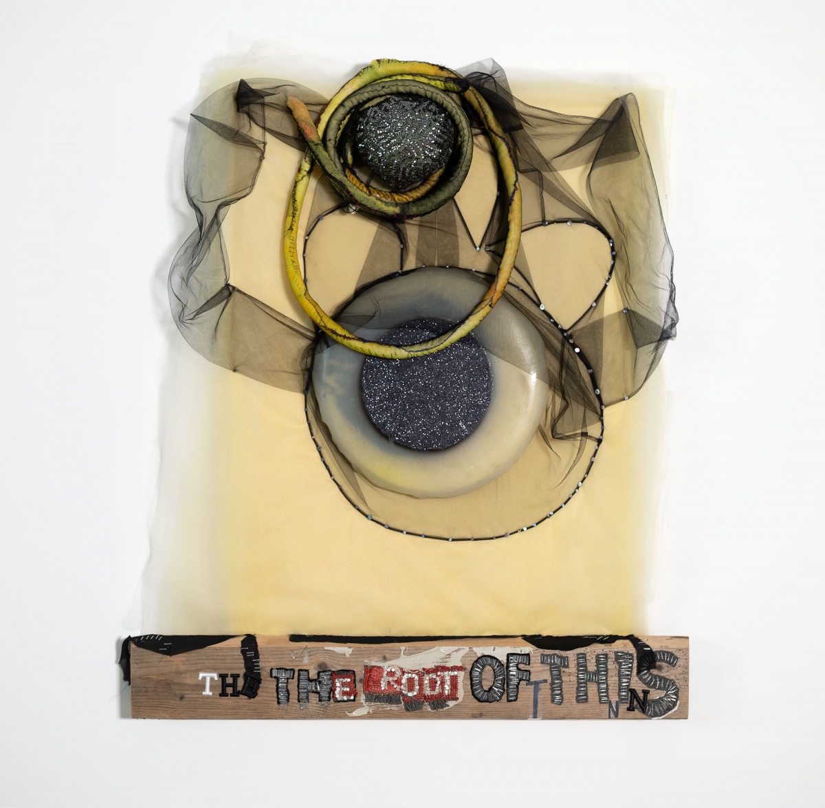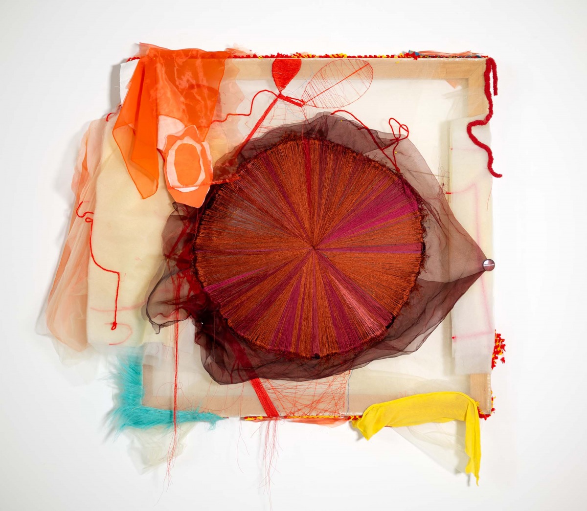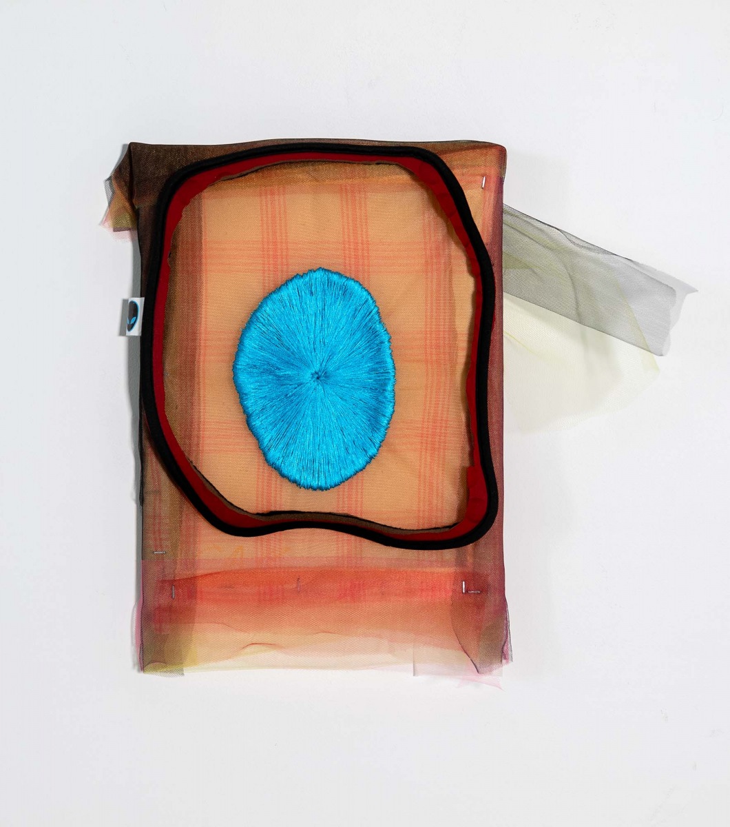 Fabric remnants, paper, wood scrap, thread, bits of hardware and discarded notions from consumer culture accumulate energy and presence as she stitches, bundles, cuts, recuts, patches, layers and folds – sorting possibilities while watching for a move. Tulle is foundational to Couzens’s constructions. She uses it like paint, its transparency and nuanced palette kindle the senses, sending shivers that deliberately undermine Date Night notions of femininity. It’s a fragile medium, but heaviness and density can be felt; identities dissolve into pure form, color fields float and flow, calling