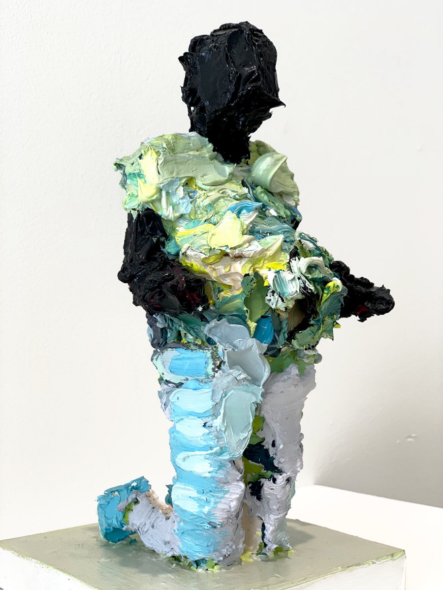 Lavaughan Jenkins’s sculptural paintings tell a story, a story that reflects the ordinary, the non-heroic, the quiet countenance of a single Black individual. Modest in scale, sensuous in materials, the lone figure acts as a “Watcher,” a witness to their experience. Jenkins sees successive layers of oil paint as assembled history in the Watcher’s story. Sculpted from molding paste and foam, building a thick colorful impasto, Jenkins is able to individualize each sculpture’s gesture, attitude and expression. The emotive power in his community of figures is the embodiment of grace and beauty.
