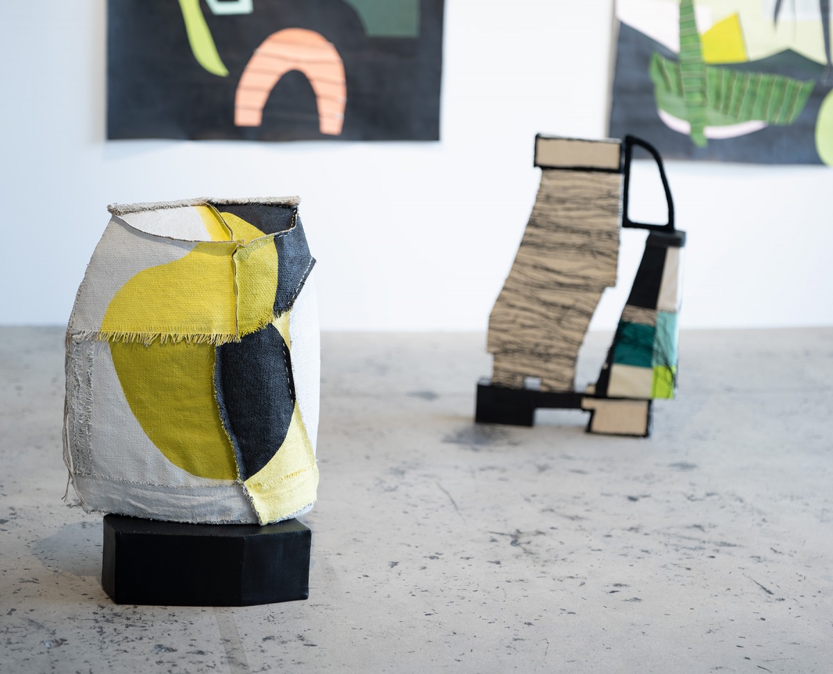Monica Rezman (b. 1958) is a multimedia artist who explores intimacy within abstraction through the use of traditional media and everyday found materials. She studied painting and textile design at the School of the Art Institute of Chicago in 1979. Rezman’s approach to her studio practice is influenced by the skills she learned while working in fashion. Cutting pattern, sewing raw edges, her sculpture and paintings are a collage of colored, patterned shapes and stitched abstract forms stacked upon fields of cut canvas, or in towering soft 3D forms as floor sculpture.