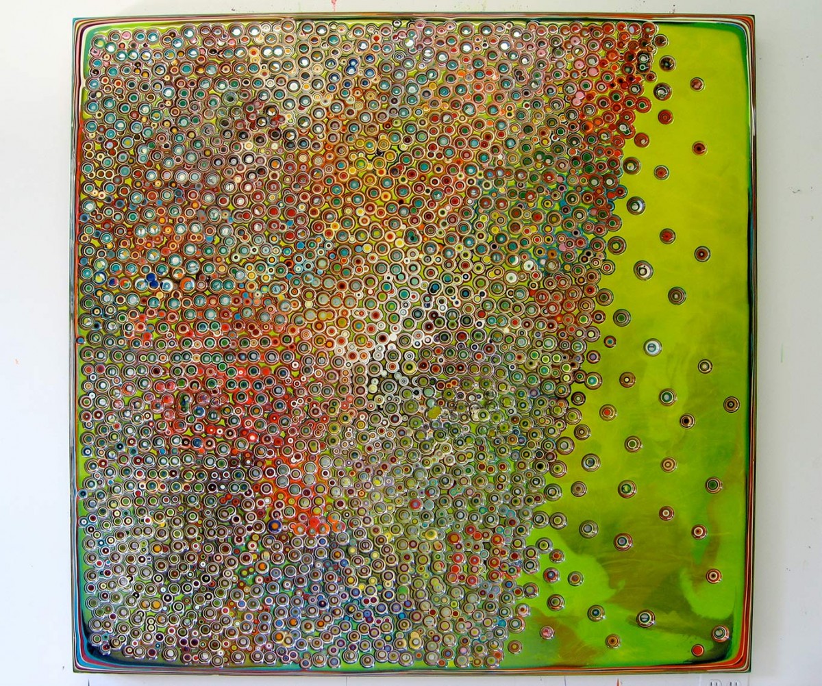 German artist Markus Linnenbrink extends his exploration of material, line, and color in his exhibition FIFTEEN MINUTES WITH YOU. Linnenbrink will commit palette to wall in a site-specific installation, along with drilled and poured epoxy resin paintings, and sculpture. Linnenbrink expanded the dialogue of Gene Davis in his resin paintings of vertical stripes, discarding the formalist theory of Greenbergian post-painterly abstraction for a purely hedonistic, intuitive indulgence of color and process. His paintings are layered, with vertical pouring of metallic and fluorescent pigments suspended in a pristine epoxy resin; or drilled, revealing a dense environment of material and eye- popping color. His intuitive application of material infused with pigment forms dynamic paths that invigorate the formal constructs of the work.