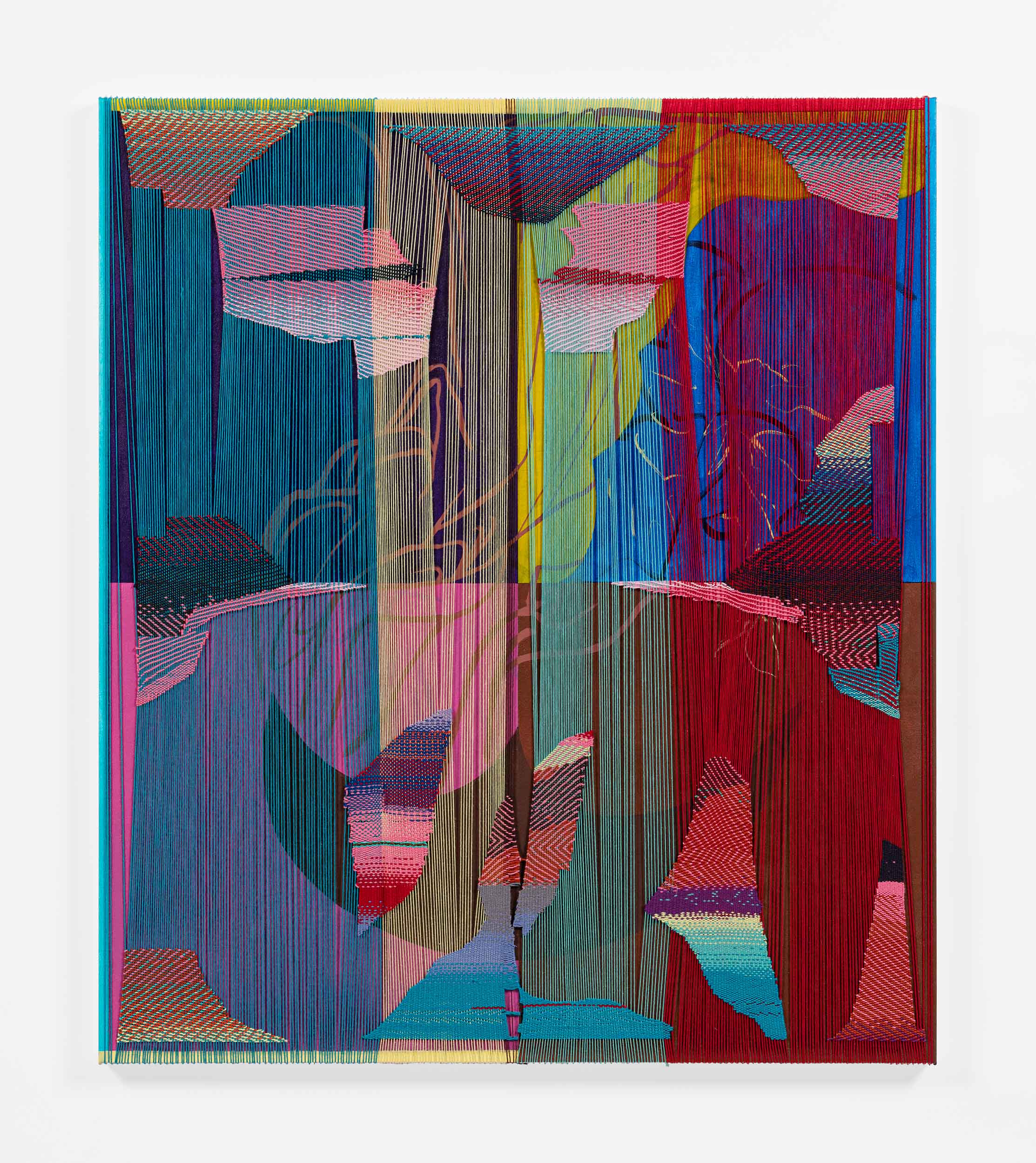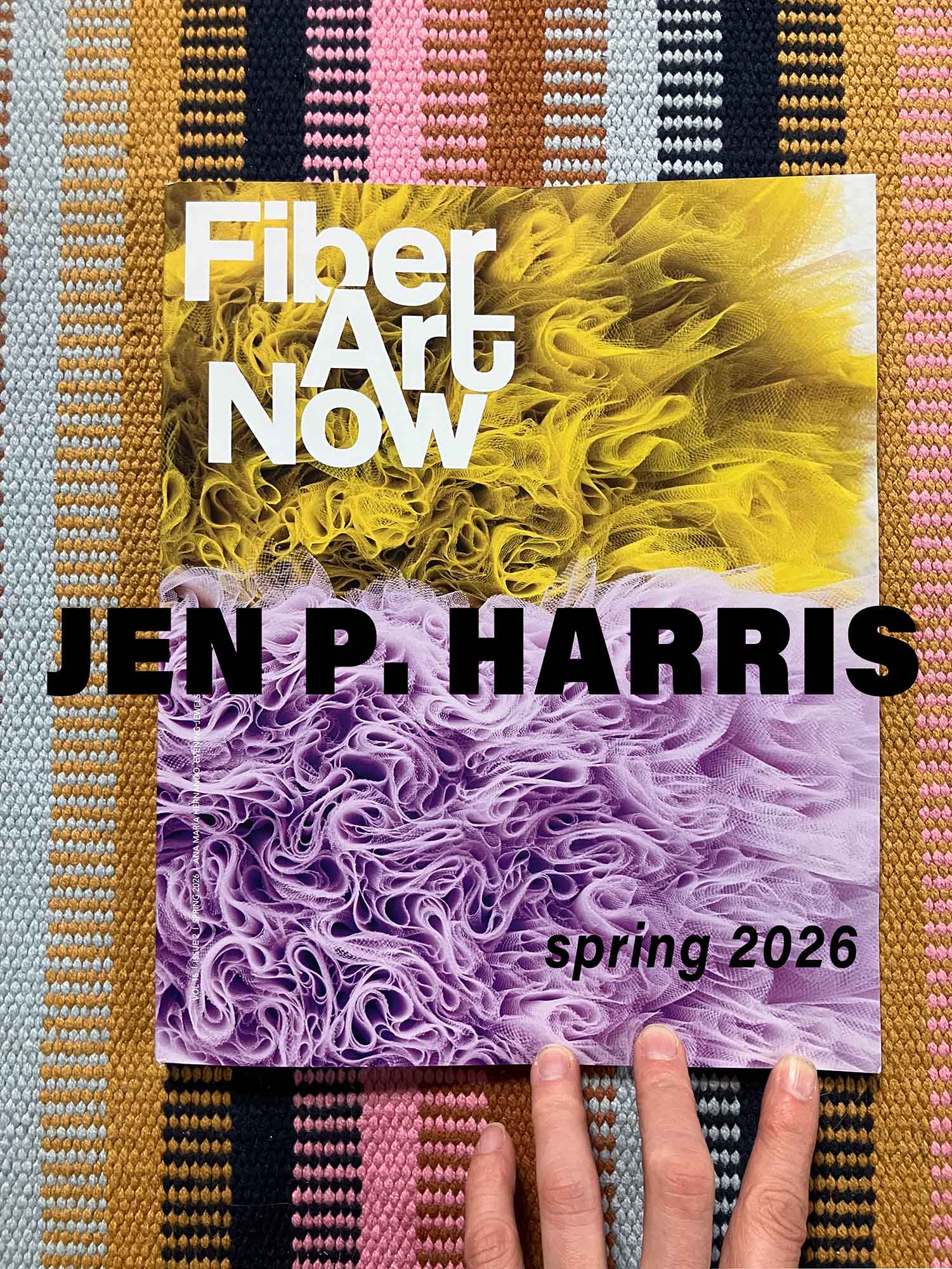 The artist in this review, Jen P. Harris, combines a painted canvas with a woven layer over it.