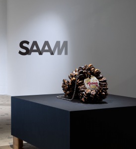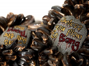 The lyrics from Bombs Over Bahgdad (Don’t Pull the Thang Out) come from rapper duo OutKast’s 2000 track B.O.B. Forward three years, after the start of the United States’ second war with Iraq, the song became an anthem representing the nation’s failed war in the Middle East. However, the original intent of the song had more to do with life for African Americans living in the ghettos of America. Andre 3000 and Big Boi paint pictures of the complexities of living in the ‘hood’ – a place with well-known institutional problems but also a place with daily joys for those who call it home. The lyrics mirror a common African American phrase, “don’t start no stuff, won’t be no stuff” – a colloquial interpretation of Proverbs 17:28. The huge ‘chocolate’, aka “humpback’ cowrie shells used on this piece render them completely unusable for their original intent to protect both the hands of the boxer and face of the opponent during a boxing match. These shells are only found in the Indo-Pacific region of the world, with the batch used by Broxton specifically originating in the Philippines, where his maternal grandmother was born.