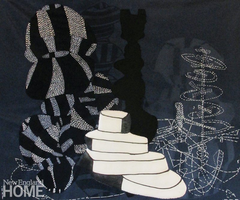 However, she also adds layers, such as fabric collage pieces, hand stitching, three-dimensional appliqué elements, and more. “I am now able to combine my love of printmaking, painting, sculpture, and drawing, and merge them into one cohesive textile composition,” she says.