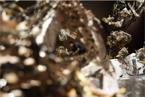 Sormin, who incorporates a variety of multimedia elements into her work, including found items, renders this mountain in fiery reds and oranges, juxtaposed with darker, earthier browns and greys. The volcano’s caldera is a raised wooden platform that viewers can walk on. Webbed walls of mangled debris, scraps of metal and twisted pipes surround it, colliding and exploding at acute angles.
