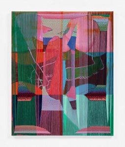 “This departure from the material hierarchy of paint over canvas, this repositioning of cloth, conventionally rendered invisible and inert by paint, as an agent with a presence all its own, is quite possibly the thing I was searching for all those years. It lets me stir things up. Working with the thread has become the method by which I can make visible that which I sense in the painting but cannot reach with paint alone.” – Jen P. Harris